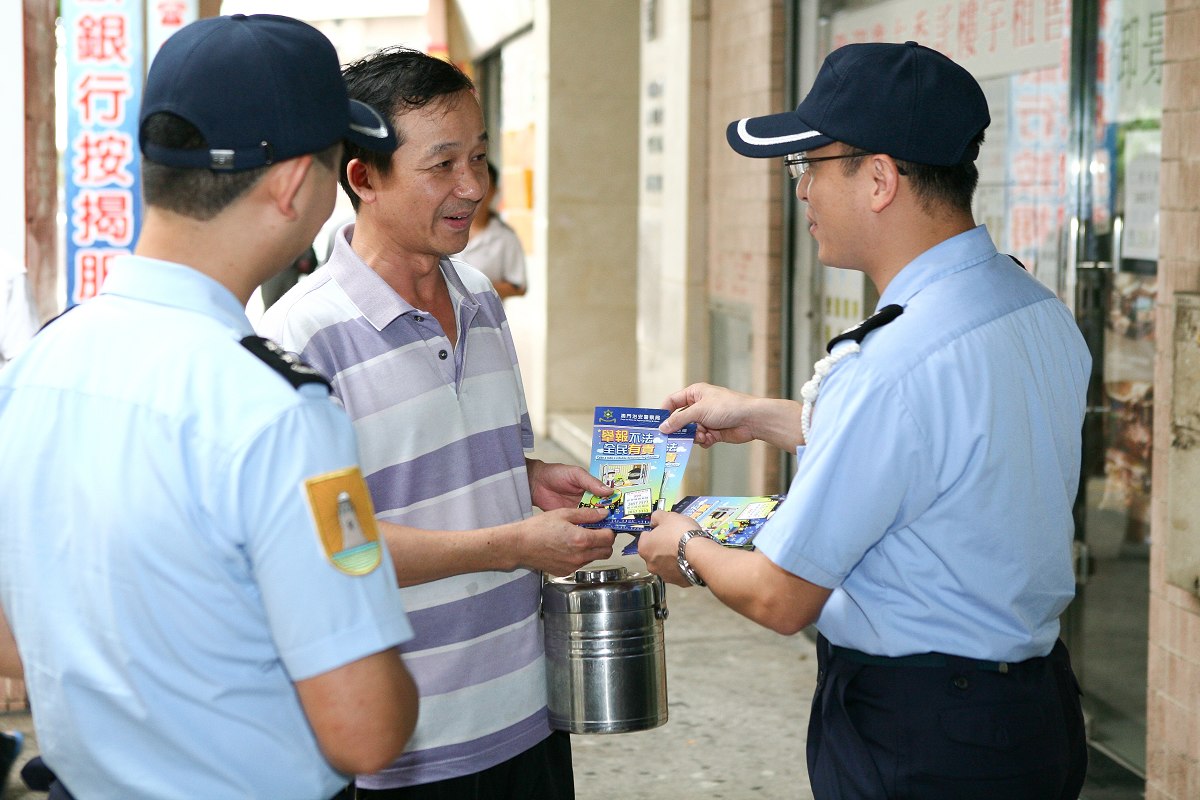 今天上午,本局公共關係處副警司黃超文及澳門警務廳副警司陳溥棠到澳門東北區保利達花園及廣福祥花園進行大廈滅罪宣傳工作,向居民派發“慎防門戶保安全”小及“舉報不法.全民有責”小冊子,講解常見大廈犯罪情況,提醒注意家居安全,同時暑期外出旅遊時須注意加強防盜措施;呼籲住客守望相助,管理員及住客遇到犯罪及可疑情況應報警求助,勿讓不法份子消遙法外;宣傳亦得到大廈管理處及食肆的支持,在十多幢大廈及食店、商店內張貼宣傳海報,提高防罪意識。此外,亦對圍繞屋苑範圍的市民、行人等宣揚防治犯罪、警民合作的訊息。整項宣傳活動由11時開始至12時半左右結束。