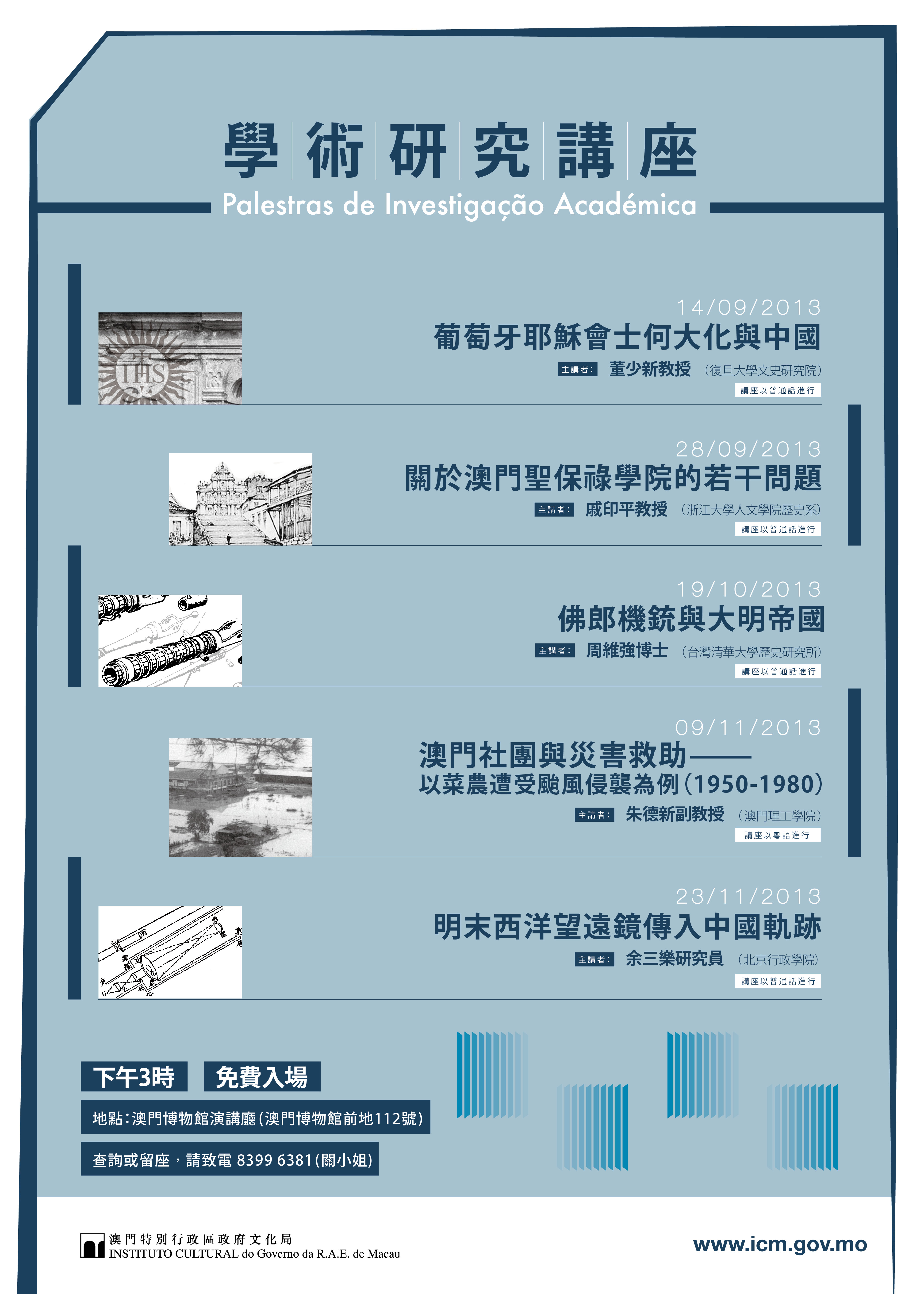 十一月亦將舉辦兩場“學術研究講座”,包括九日由澳門理工學院朱德新副教授主講的“澳門社團與災害救助——以菜農遭受颱風侵襲為例(一九五零年至一九八零年)”及二十三日由北京行政學院余三樂研究員主講的“明末西洋望遠鏡傳入中國軌跡”。詳情請參看文化局網頁www.icm.gov.mo。有關講座的查詢或留座,請於辦公時間致電八三九九六三八一與關小姐聯繫。