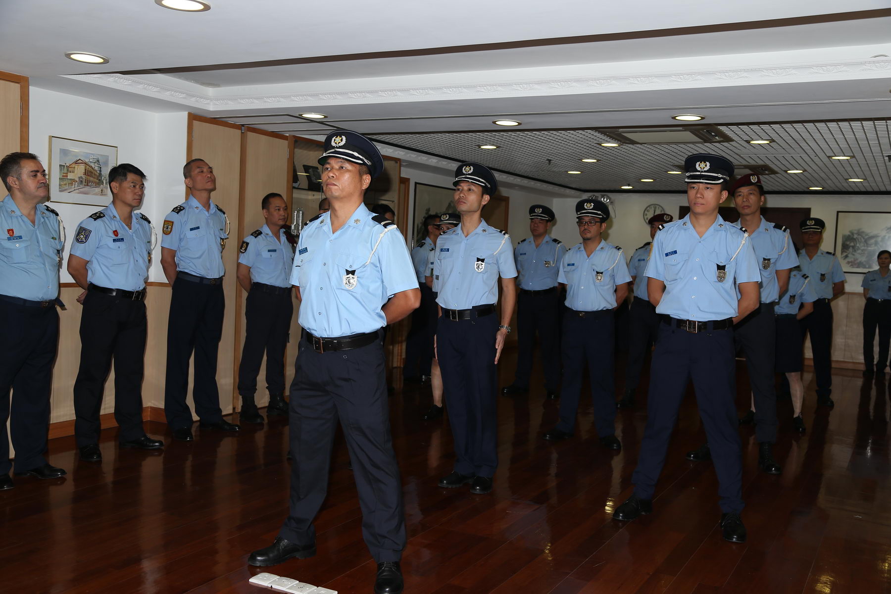 今天(十月二十五日)中午12時,在治安警察局總部貴賓室舉行了警長晉升儀式。儀式由治安警察局局長李小平警務總監及副局長黎錦權副警務總監及梅山明副警務總監主持。出席儀式的還有局內各部門的廳長及負責人,為同僚作出祝賀。晉升為普通職程警長共有13人 (男性11人,女姓2人)。