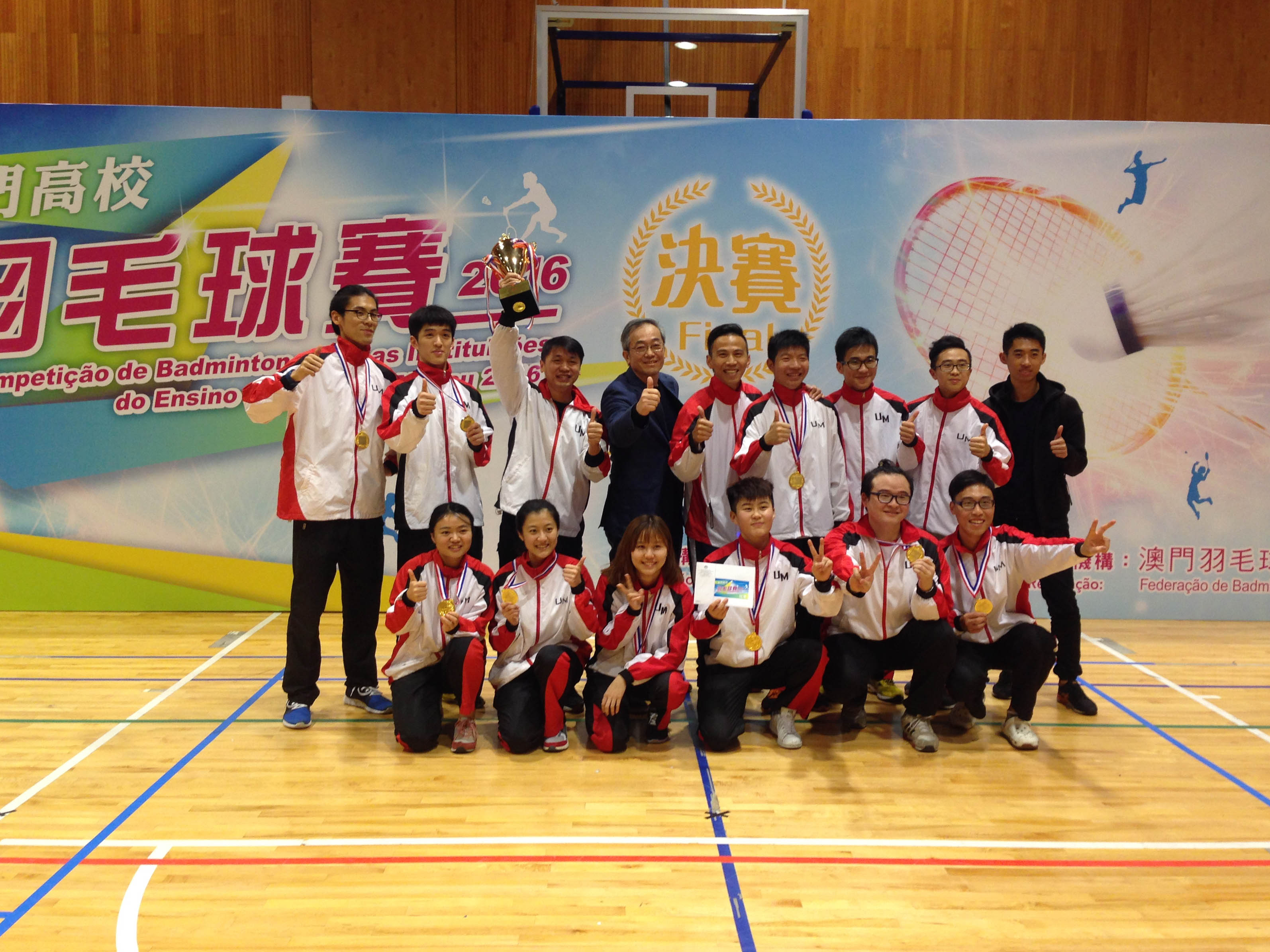 澳門大學羽毛球隊日前力壓澳門理工學院奪得首屆澳門高校羽毛球賽冠軍。今次賽事由高等教育輔助辦公室舉辦,吸引七所本地高等院校參加,包括澳門大學、澳門科技大學、聖若瑟大學、澳門城市大學、澳門理工學院、澳門鏡湖護理學院和旅遊學院。澳大副校長(學生事務)程海東教授也到場為學生打氣。