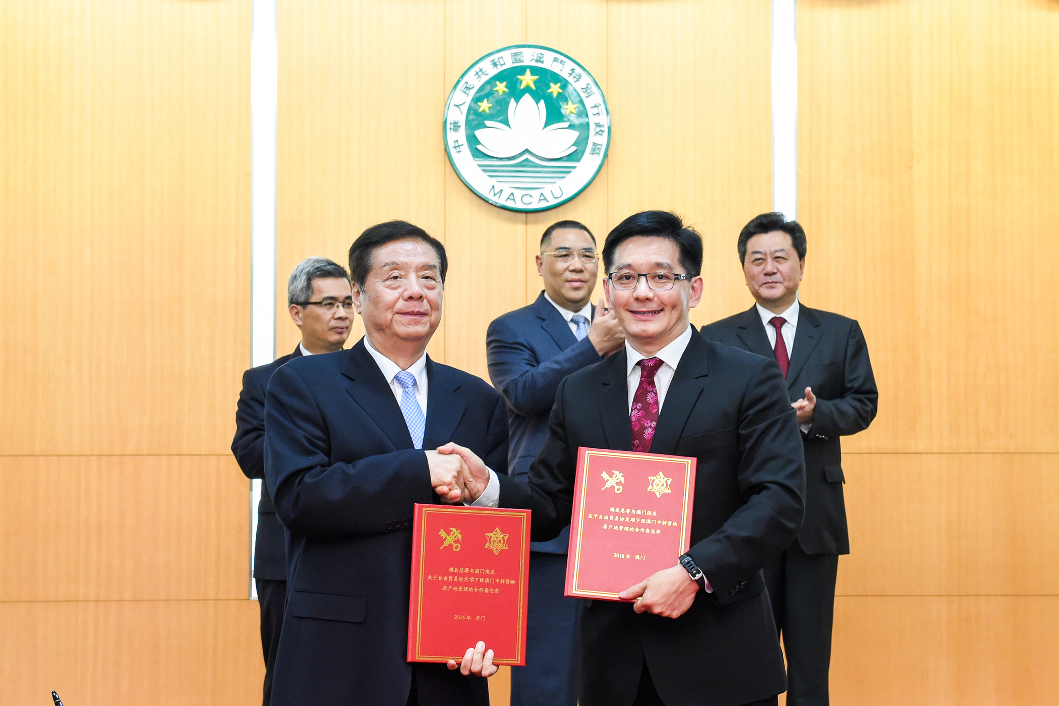 今天(25日)下午,海關總署于廣洲署長與澳門海關黃有力關長於澳門特別行政區政府總部內,在行政長官崔世安、中聯辦主任李剛及保安司司長黃少澤見證下,簽署了《海關總署與澳門特別行政區政府關於在澳門特別行政區管理水域和陸上邊界預防及打擊走私犯罪的合作安排》及《海關總署與澳門海關關於自由貿易協定項下經澳門中轉貨物原產地管理的合作備忘錄》。