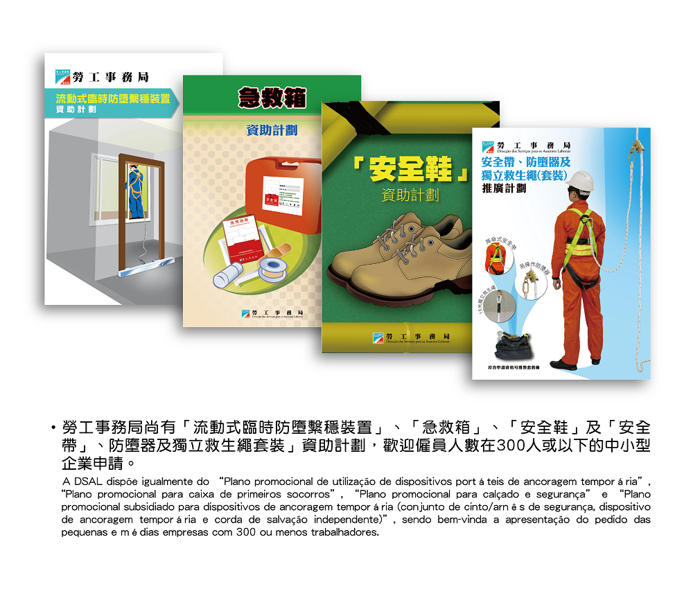 除上述計劃外,勞工事務局尚有「流動式臨時防墮繫穩裝置」、「急救箱」、「安全鞋」及「安全帶、防墮器及獨立救生繩套裝」資助計劃,歡迎僱員人數在300人或以下的中小型企業申請。有關各項資助計劃詳情可致電83999454,或瀏覽勞工事務局網頁內的職安健天地專頁(www.dsal.gov.mo),亦可親臨勞工事務局(地址:澳門馬揸度博士大馬路221號先進廣場2樓)索取資料。