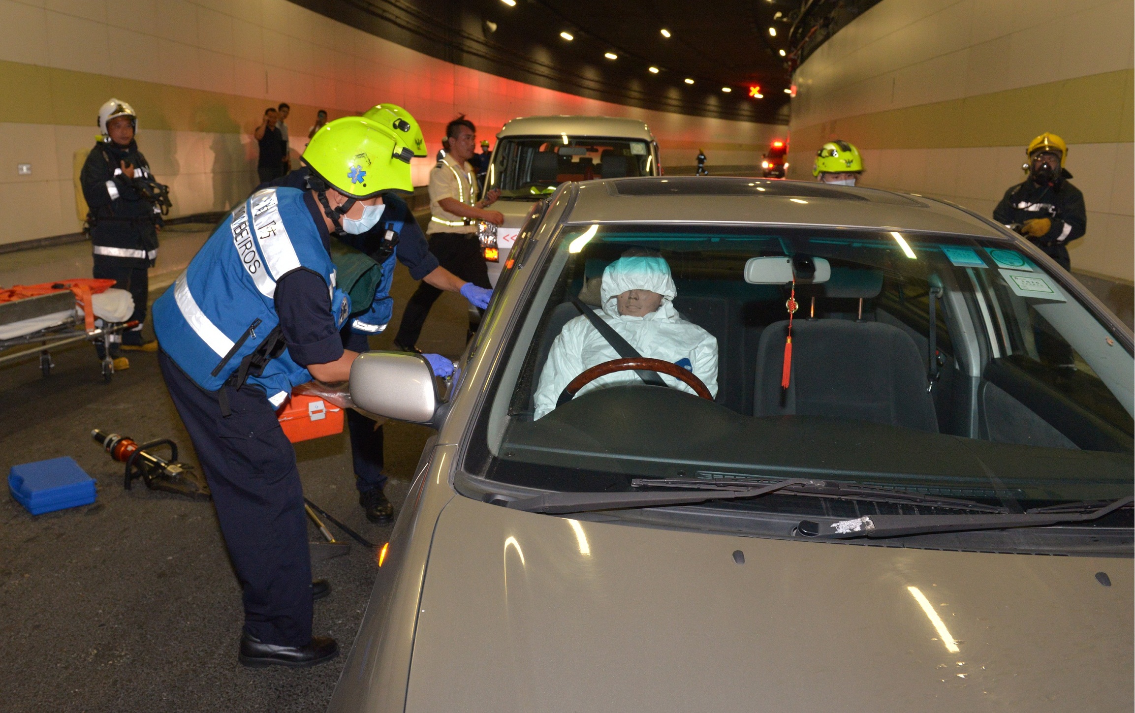 演習模擬於橫琴往氹仔方向隧道內有三輛私家車發生碰撞,並且引致中間的私家車冒煙起火,有一名司機被困車內。消防局接到報警後,立即按照有關預案派出救援車輛到達現場,展開救援、滅火及疏散工作。