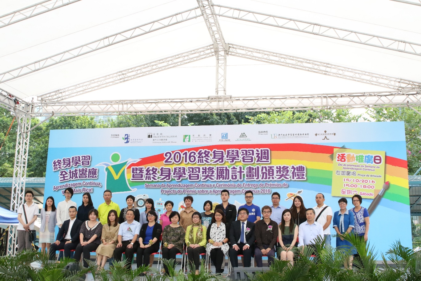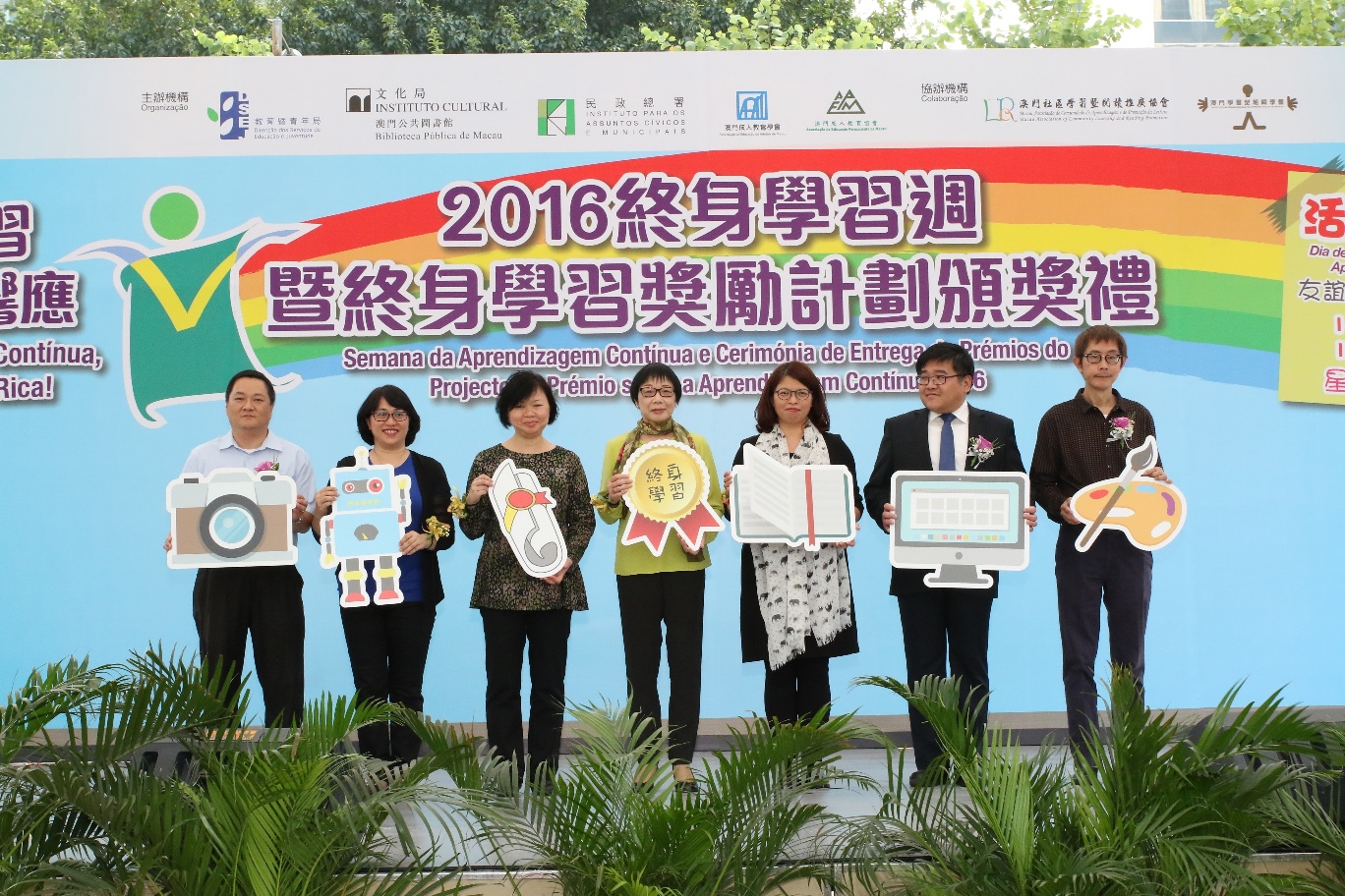 “2016終身學習週暨終身學習獎勵計劃頒獎禮”於10月15日(星期六)下午4時至6時半假友誼廣場舉行,出席活動的主禮嘉賓包括教育暨青年局副局長郭小麗、教育暨青年局教育廳廳長梁慧琪、文化局公共圖書館管理廳廳長鄧美蓮、民政總署行政輔助部培訓及資料儲存處處長黃婉嫻、教育暨青年局延續教育處處長江毅、澳門成人教育協會理事長徐永達及澳門成人教育學會秘書長黃偉傑,以及已加入終身學習獎勵計劃的聯網機構及本年度新加盟的聯網機構代表。他們分別向獲獎的市民進行頒獎,並邀請獲獎者分享學習心得,讓參與者見證其學習成果。活動期間還進行了 “終身學習獎勵計劃"聯網機構加盟儀式。此外,現場亦有各項舞台表演及多個以終身學習為主題的遊戲及戶外工作坊,吸引了不少市民到場參與。