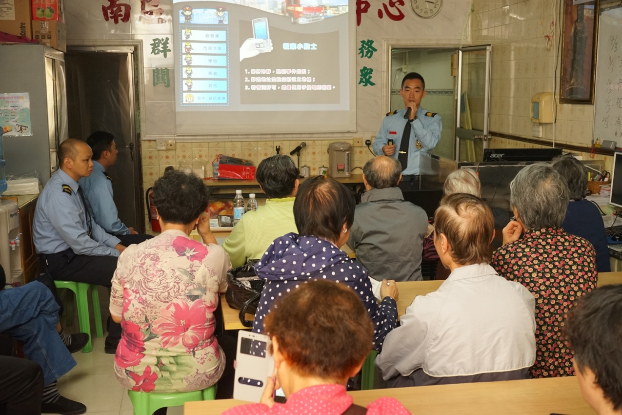 消防局於清明節前夕分別拜訪“民眾建澳聯盟石排灣辦事處”、“筷子基坊眾互助會”及“新橋區坊眾互助會”,座談期間本局介紹了清明節的防火宣傳工作及行動部署,並就防火、滅火及救援等工作的交換意見,及後聯同其會員、義工一同到區內派發宣傳單張及張貼海報;同時亦為“南區四坊會頤康中心”、“民眾建澳聯盟石排灣辦事處”、“筷子基坊眾互助會” 、“新橋區坊眾互助會”及區內一帶居民進行防火、救護及燃料安全講座,從而強化區內居民的消防安全意識。