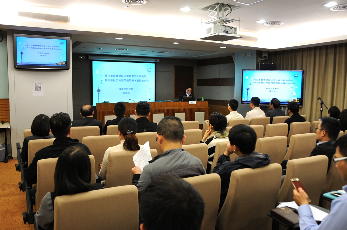 海事及水務局代表總結了近年澳門的節水情況,透過社區巡禮及嘉年華、校園節水宣傳劇、故事册、水資源互動館等提高市民節水意識。特區政府亦透過經濟手段推動節水,「自來水價格機制」體現了多用者付更多,而節水回贈計劃至今總節約水量達830萬m3,相當於約3,300個奧林匹克游泳池的水量。另外,近年的管網漏損率在積極推進下得以進一步降低,《澳門供排水規章》亦正計劃修訂,以加強飲用水水質安全。