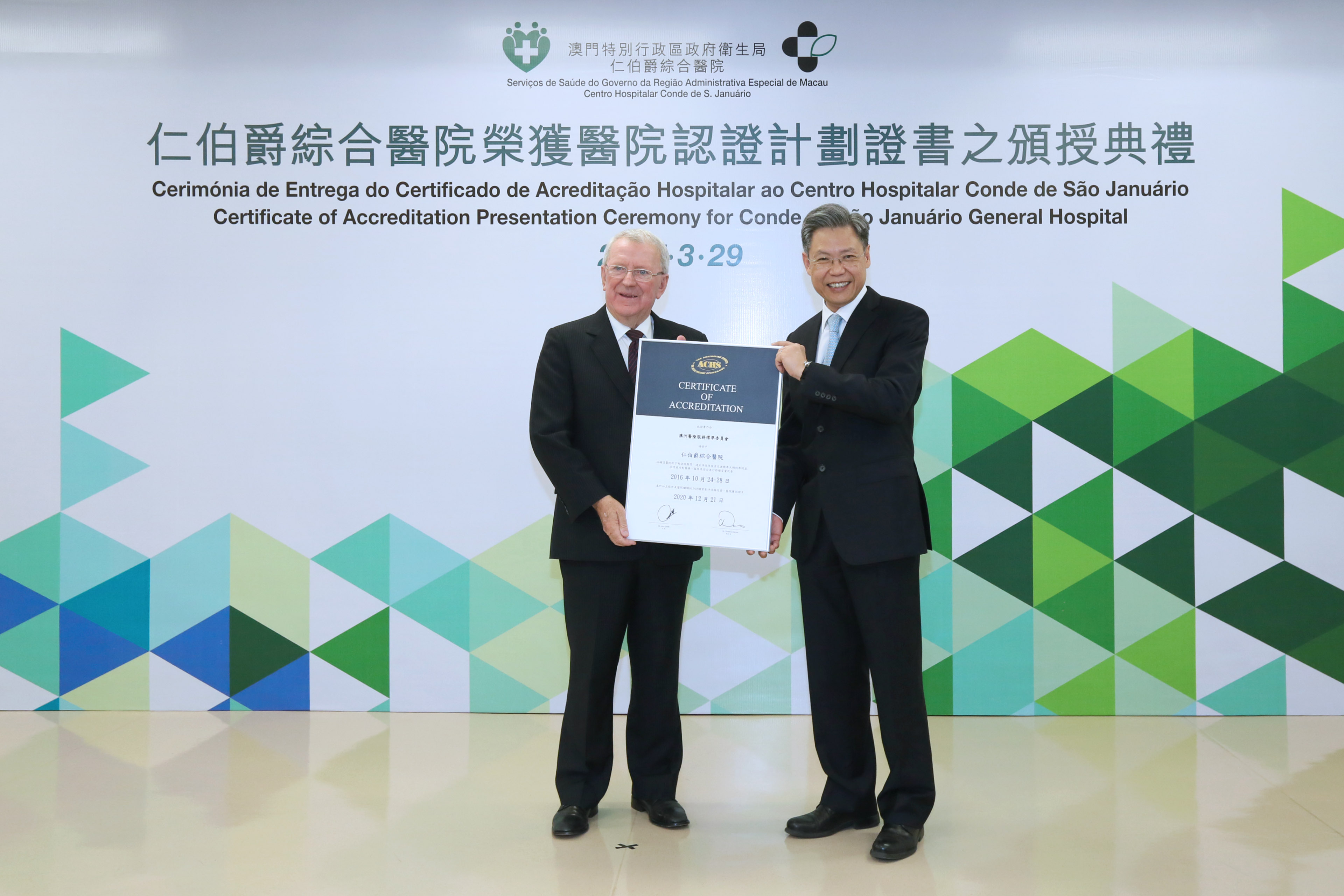 仁伯爵綜合醫院繼2012年獲澳洲醫療服務標準委員會(ACHS)的評審認證後,去年10月24至28日再度通過認證,成為本澳首間和唯一通過ACHS認證的醫院,標誌著本澳醫療技術水平和服務質素達到國際標準並不斷提升。今天(3月29日),舉行了“仁伯爵綜合醫院榮獲澳洲醫療服務認證標準委員會醫院認證證書頒授典禮” ,由ACHS的John Smith主席、Desmond Yen執行董事專程來澳向仁伯爵綜合醫院頒授證書。出席嘉賓包括:社會文化司譚俊榮司長、社會文化司司長辦公室葉炳權主任、衛生局李展潤局長、仁伯爵綜合醫院郭昌宇院長、醫務委員會陳亦立副主席、還有衛生局領導層、社會文化司司長辦公室顧問、醫務委員會委員、仁伯爵綜合醫院醫護團隊等。