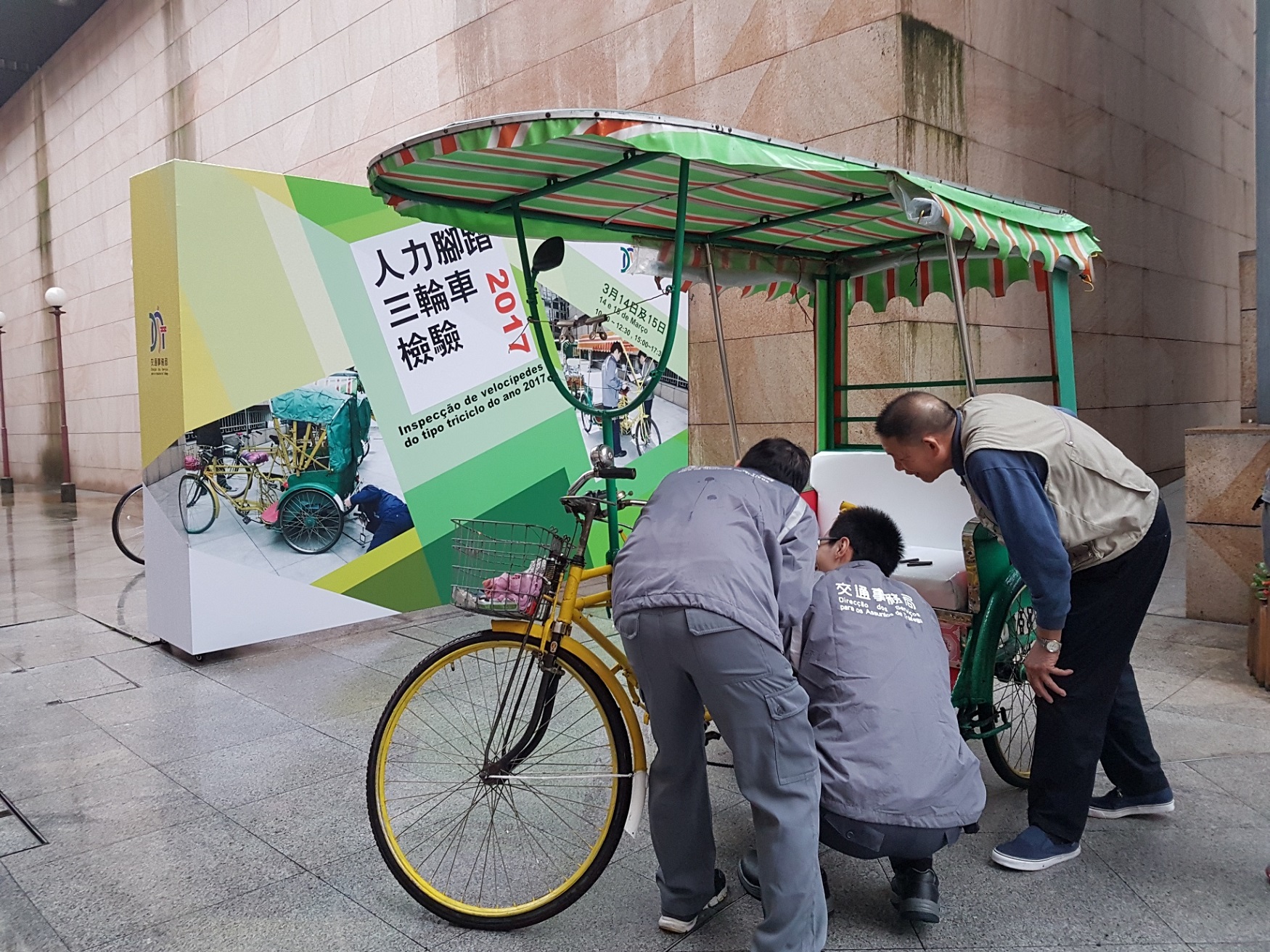 為保障人力腳踏三輪車(下簡稱:三輪車)的行駛安全,交通事務局早前為本年度私人經營的三輪車進行檢驗,受檢的52台三輪車全部合格,另有6台缺席檢驗。局方期望透過年度檢驗,提醒業者注意車輛的日常維修保養,並呼籲缺席檢驗的車主盡快把車輛駛往澳門摩托車檢驗中心受檢。
