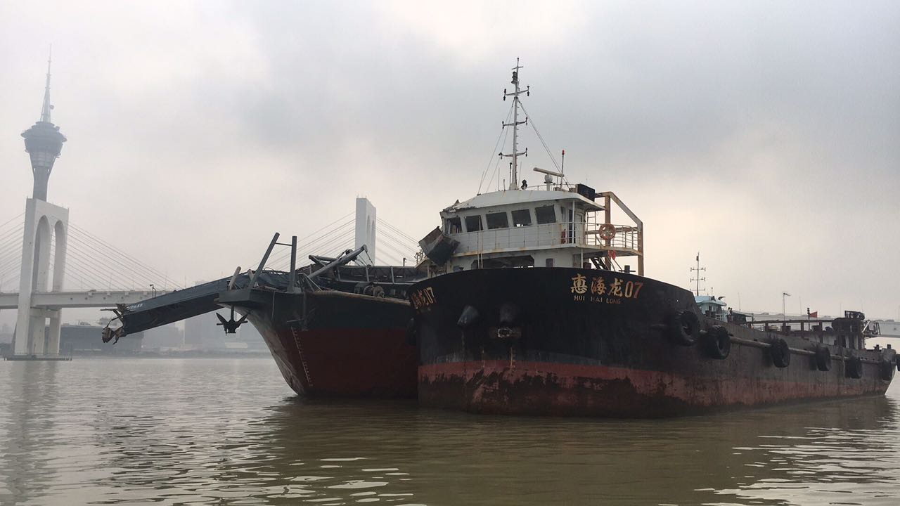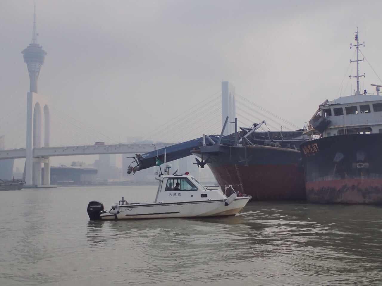 今早約凌晨二時,澳門船舶交通管理中心接報,兩艘內地貨船航經往內港航道時發生碰撞,兩船共17名船員均沒有受傷;肇事船均有不同程度的損毀,當中“粵惠州貨xxx”輸送帶損壞,“惠海龍xx”右舷駕駛樓受損。碰撞導致嘉樂庇大橋北護橋欄M17燈樁及其相連護橋樁嚴重受損,大橋未受影響;事故亦沒有對往內港航道的通航安全構成影響。
