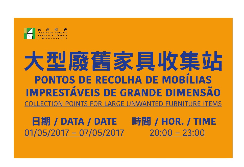 民政總署將於下週(五月一日至七日)安排特定時段,在全澳各區設六十個臨時大型廢舊家具收集站,以方便市民棄置大型廢舊家具。