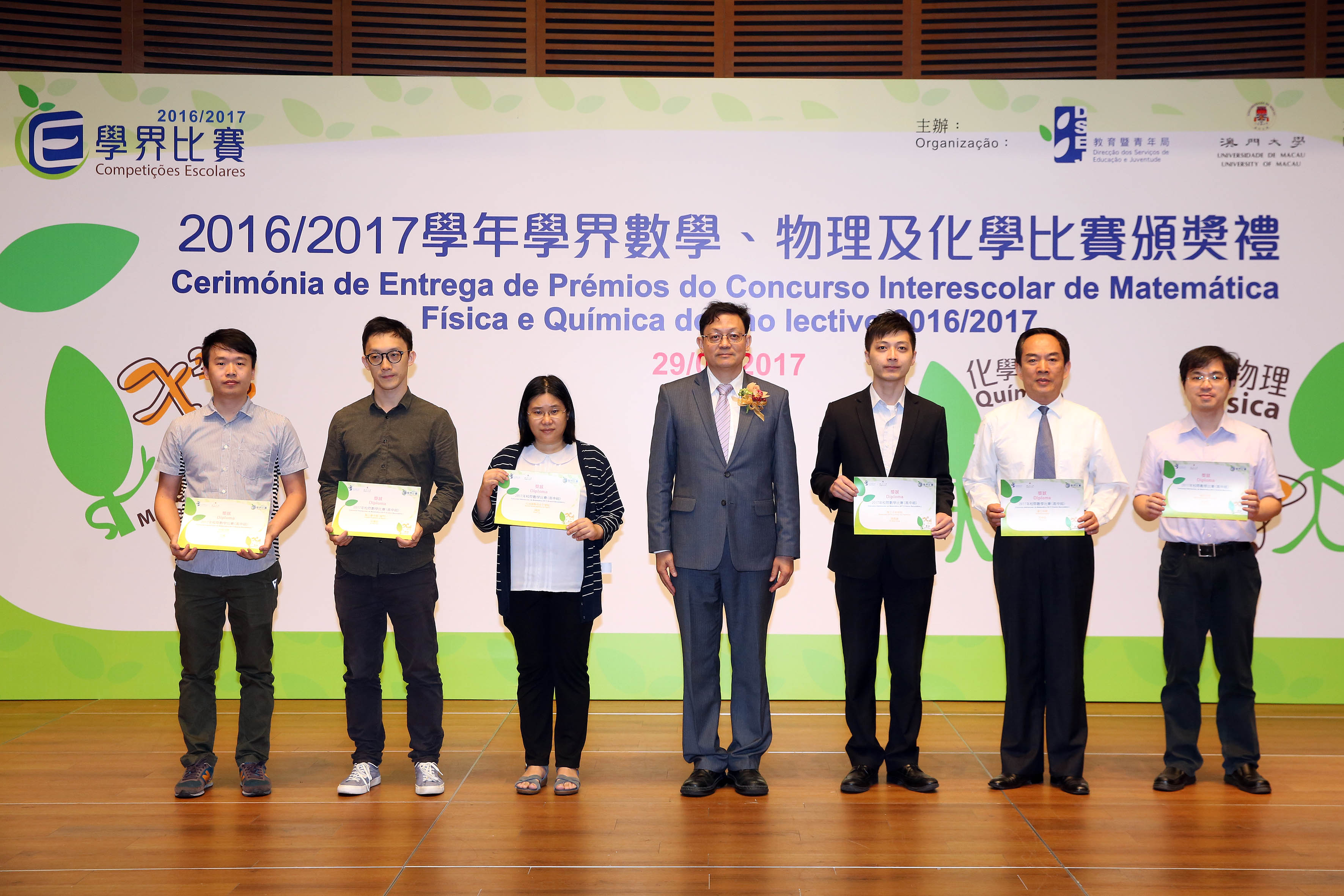 由教育暨青年局及澳門大學合辦的 “2016年澳門高中學生化學競賽” 、 “2017年澳門中學物理競賽” 及 “2017年校際數學比賽” 已順利完成,並於2017年4月29日下午假澳門科學館會議中心舉行了2016/2017學年學界數學、物理及化學比賽頒獎禮,表揚獲獎學生在上述學科比賽中所付出的努力。
