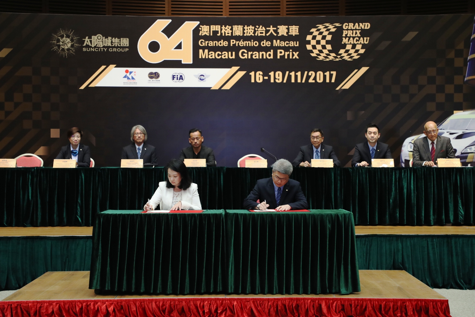 席間,澳門特別行政區政府體育局局長及澳門格蘭披治大賽車組織委員會協調員潘永權和太陽城集團行政總裁兼董事周焯華共同簽署贊助協議書並進行支票交接儀式。今年的賽事將正式命名為太陽城集團第64屆澳門格蘭披治大賽車,是太陽城集團連續第四年作為冠名贊助商。