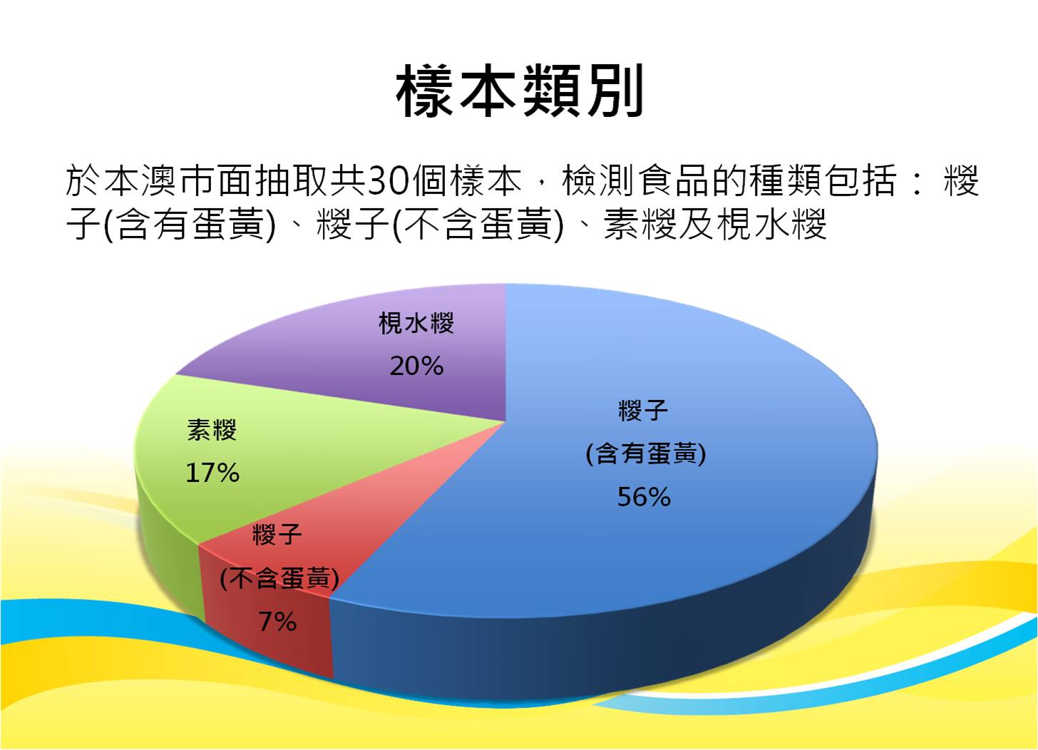 本次抽查的食品樣本包括傳統肉糉、素糉及梘水糉等共三十件,分別進行了微生物檢測包括沙門氏菌、金黃色葡萄球菌、蠟樣芽胞桿菌,以及化學檢測包括硼砂或硼酸、蘇丹紅(僅限含蛋黃的樣本)。根據化驗結果顯示,所有樣本的微生物及化學檢測結果均未見異常。