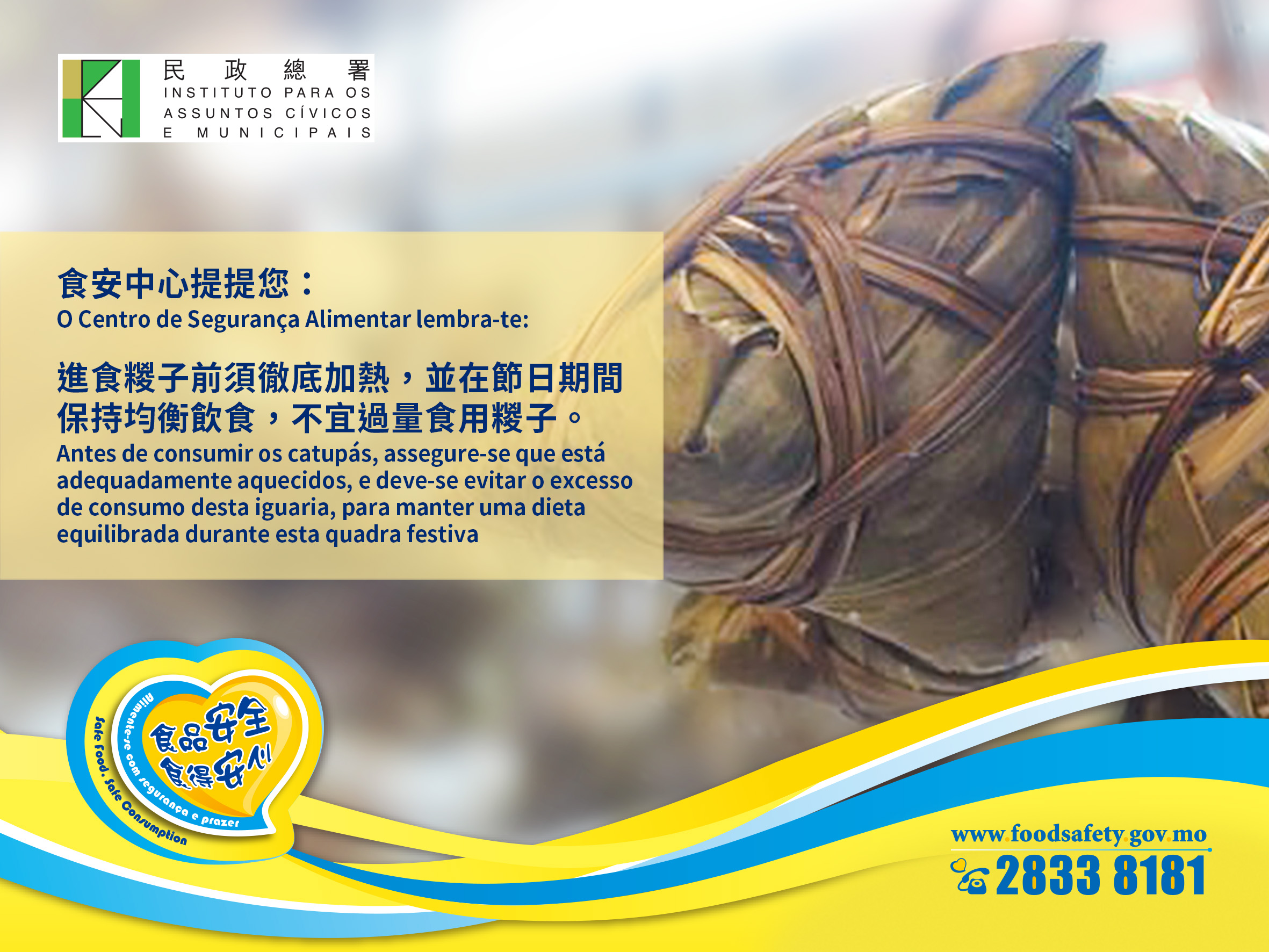 端午佳節在即,為保障市民食用安全,民政總署聯同衛生局、消費者委員會於本澳市面餐廳食肆、外賣店及超市等地點,共抽取三十件糉子樣本進行微生物學和化學檢驗,所有食品樣本的檢測結果均未見異常。