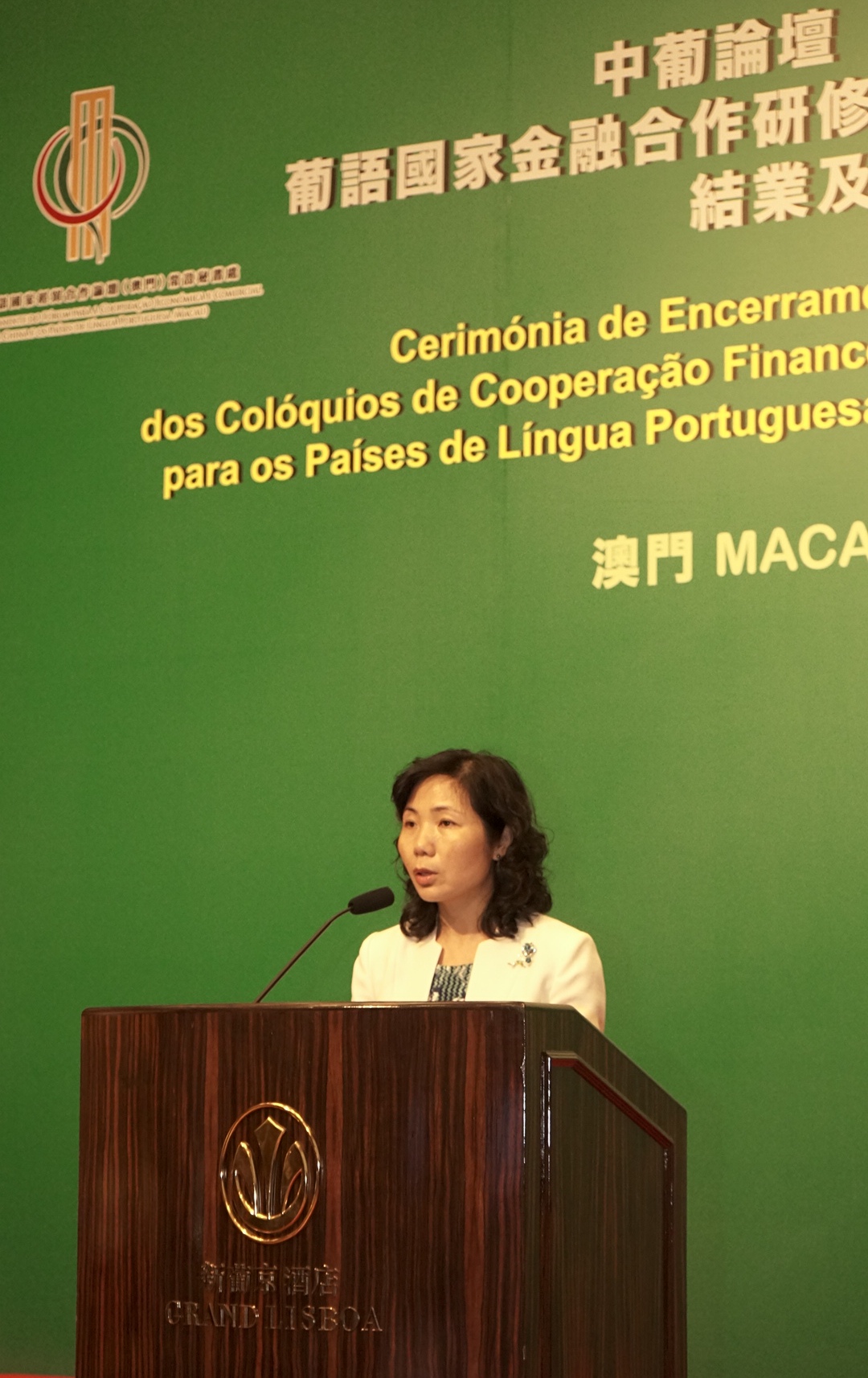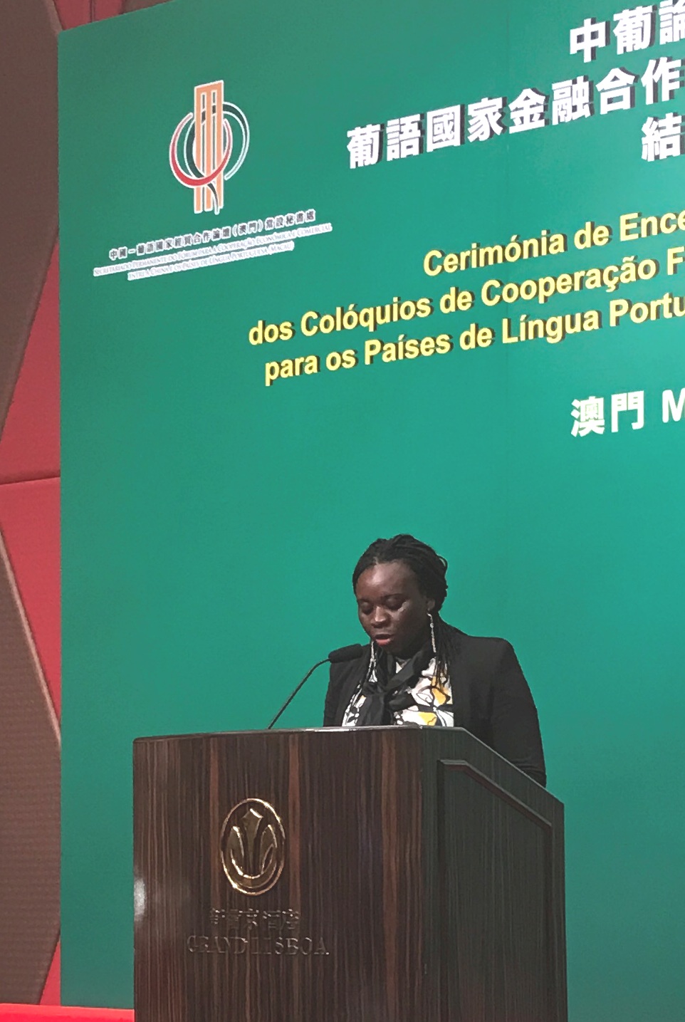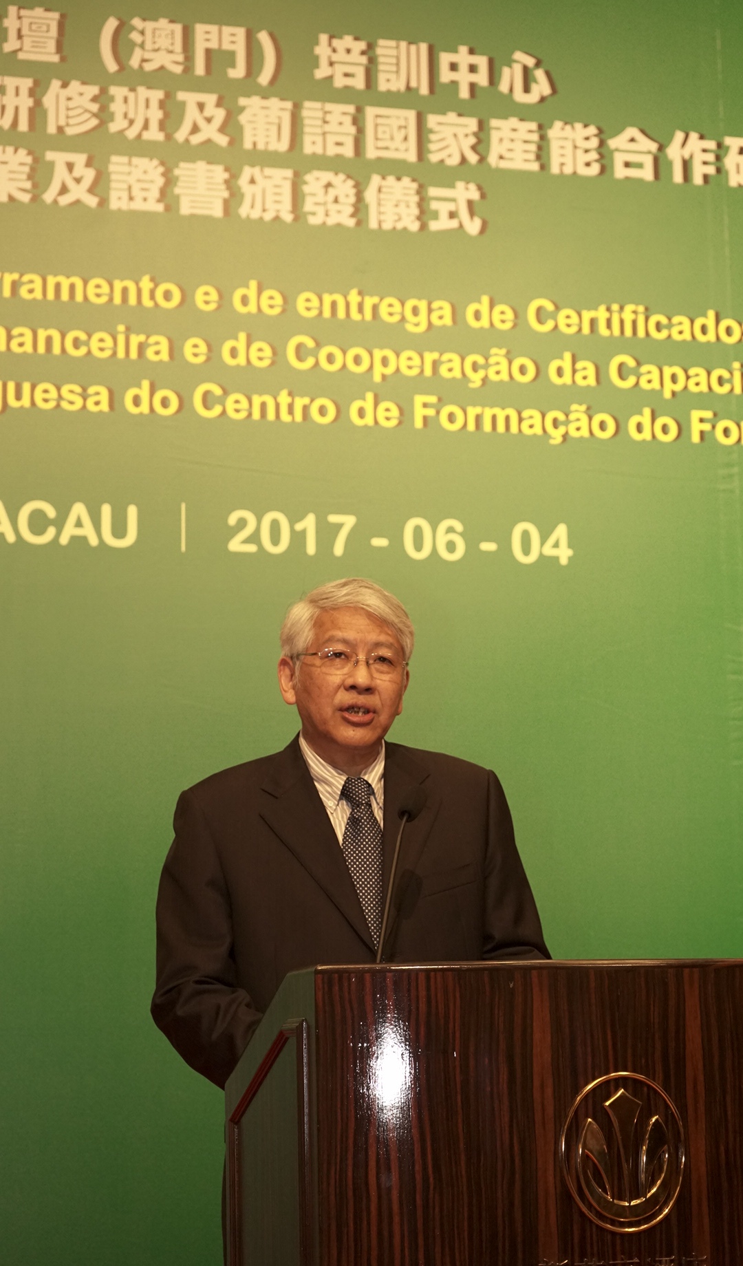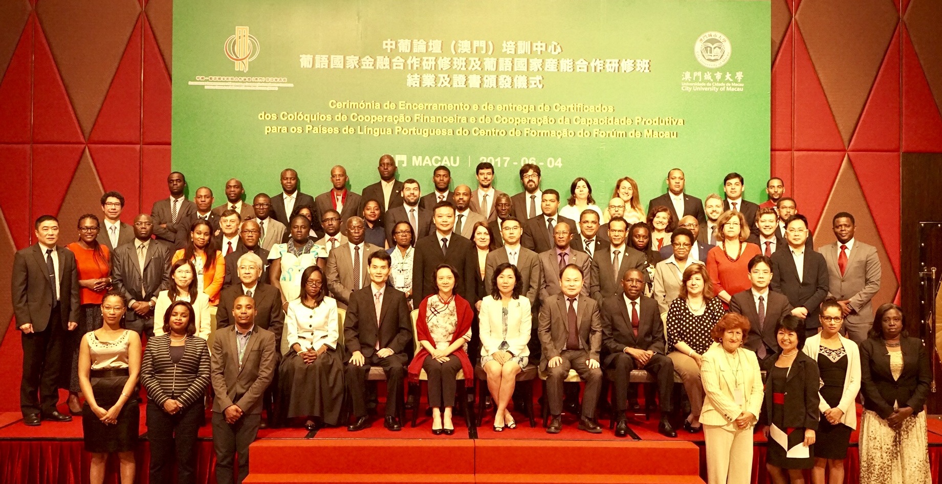 由中葡論壇(澳門)培訓中心主辦、澳門城市大學承辦的“葡語國家產能合作研修班”及“葡語國家金融合作研修班”於本月4日假新葡京酒店宴會廳舉行結業典禮暨證書頒發儀式。中葡論壇(澳門)常設秘書處徐迎真秘書長、中央駐澳門特別行政區聯絡辦公室經濟部陳星副部長兼貿易處負責人、中央駐澳門特別行政區聯絡辦公室經濟部王家寶副部長級助理、中華人民共和國外交部駐澳門特派員公署政策研究室主任冉波參贊、莫桑比克駐澳總領事瑞法歐·馬爾格斯先生、安哥拉駐澳門副領事瑪莉亞·德高斯達女士、葡萄牙駐華使館經濟參贊兼葡萄牙投資外貿促進局駐北京代表亞歷山達‧萊特女士、澳門城市大學校長張曙光教授以及論壇各葡語國家派駐代表等出席典禮。徐迎真秘書長、張曙光校長、葡語國家金融合作研修班輪值班長Marco Aurélio dos Santos Rocha及葡語國家產能合作研修輪值班長Augusta Vaz分別致辭。
