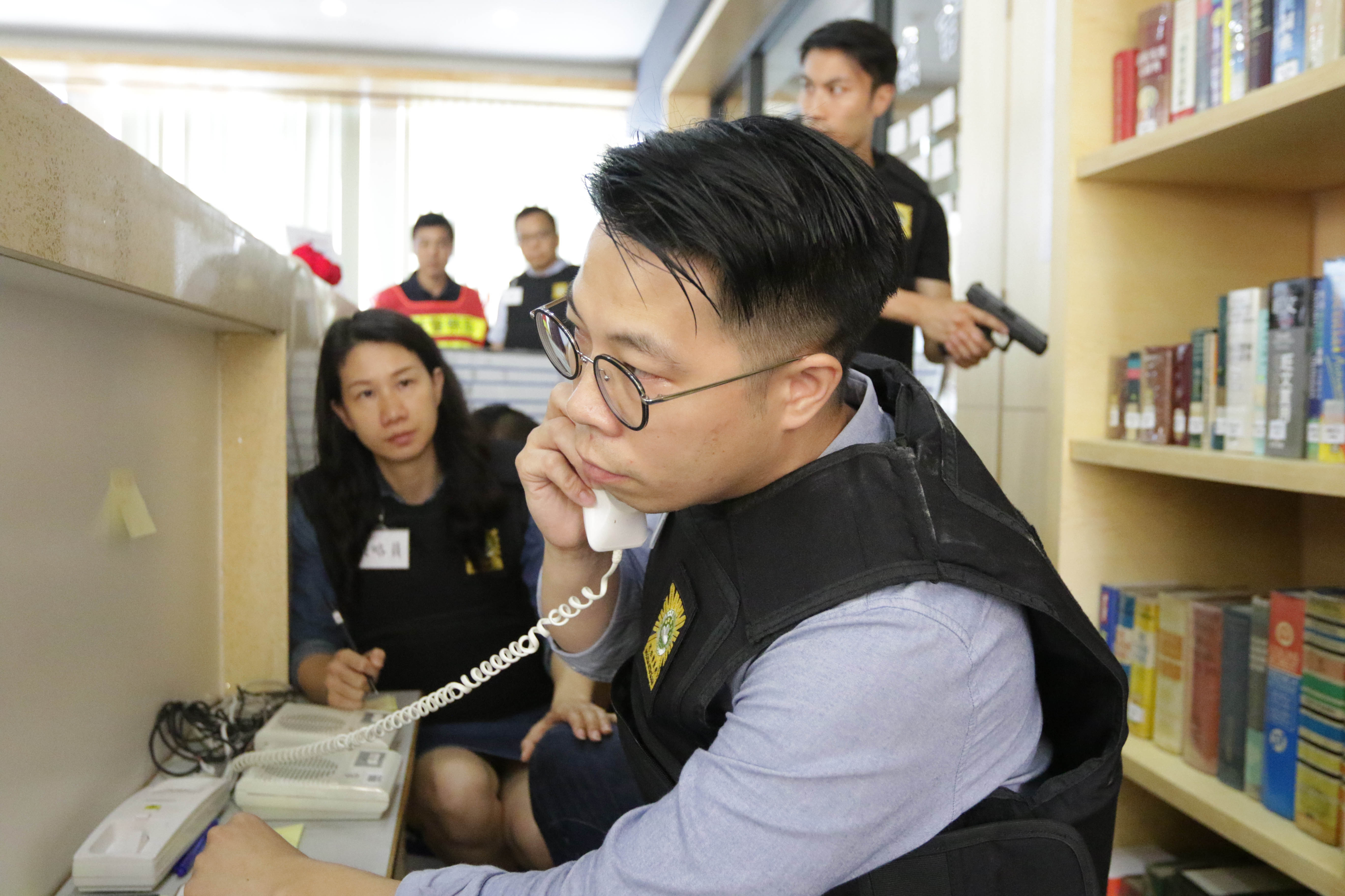 演習模擬三名男子凌晨潛入台山區一間中學盜竊,被校內職工發現後報警,竊匪挾持兩名校內職工與警方對峙,司警局危機談判組出動展開談判工作。