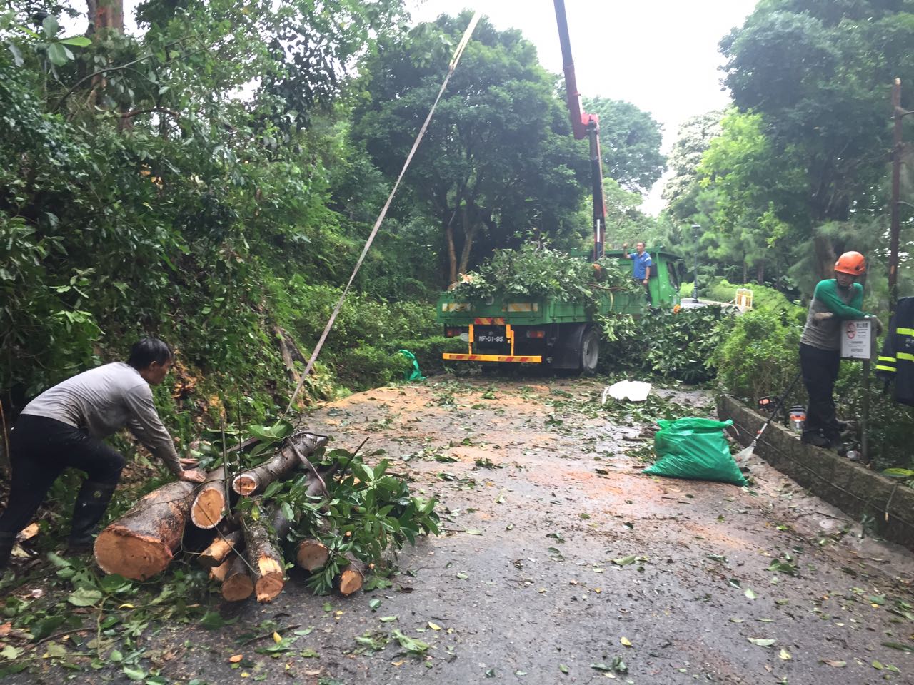 經民署人員緊急進行清理,松山市政公園樹木斷枝已經移除,大潭山環山徑落石亦已移往路側,上述地點於下午近5時解封。