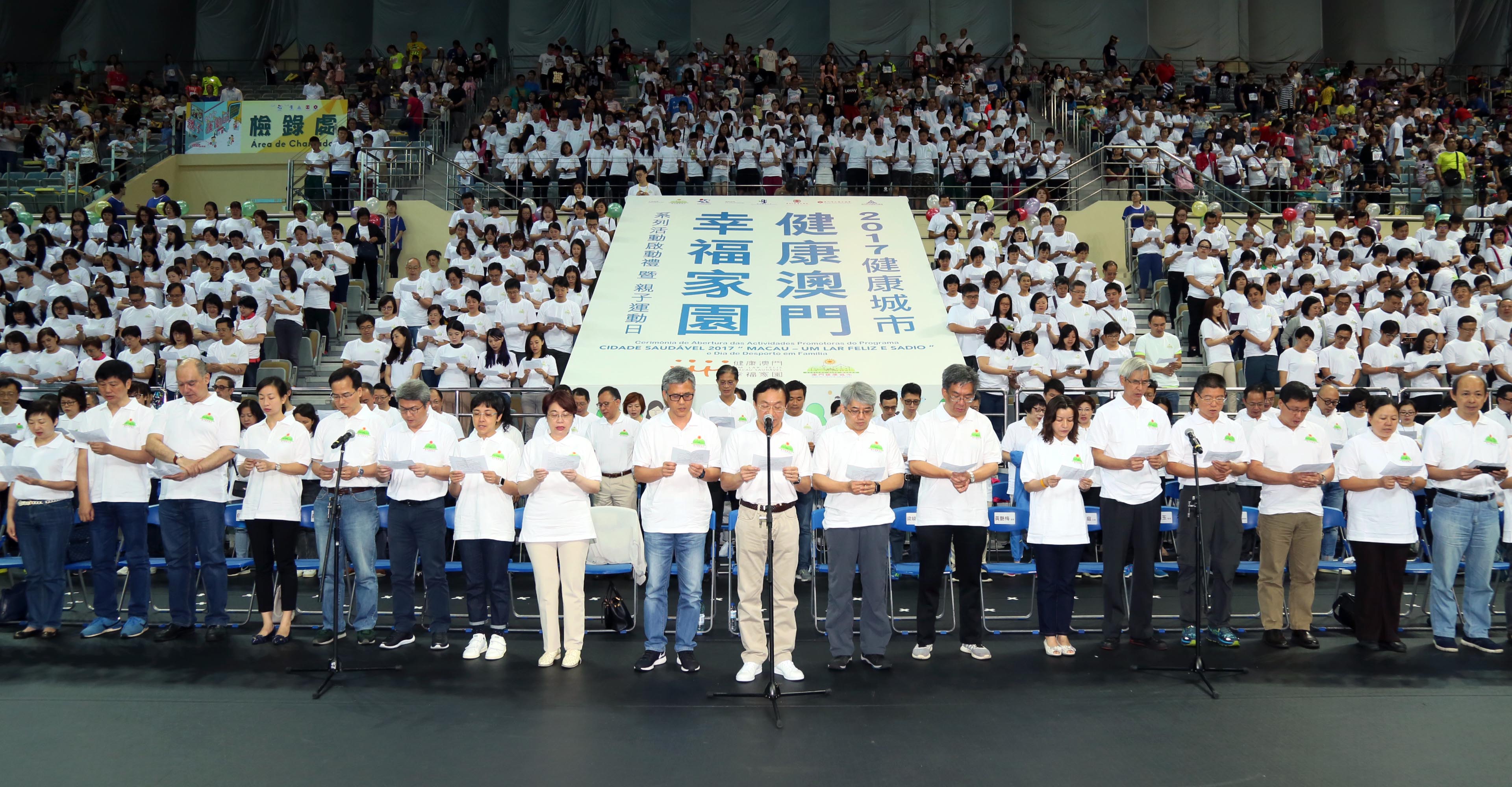 2017健康城市–「健康澳門 幸福家園」系列活動啟動禮於今(6月18日)舉行,約2000人參與了活動。社會文化司譚俊榮司長出席了啟動禮,並帶領近500名來自不同界別的嘉賓和市民一起宣讀健康約章,為要有更健康的身心,承諾積極採取健康生活方式,重視均衡飲食、保持適量運動、正常體重和愉快心情;不吸煙、少飲酒,保證充足睡眠,定期體檢,做自己健康的守護者。啟動禮上亦首次播放《幸福– 從健康發現》微電影,透過電影帶出健康對自身、家庭和社會的重要性。2017健康城市–「健康澳門 幸福家園」系列活動由健康城市委員會主辦,目的是進一步向全澳巿民推廣健康意識,養成健康飲食、定期運動的生活方式,以共同建設”健康澳門、幸福家園”。