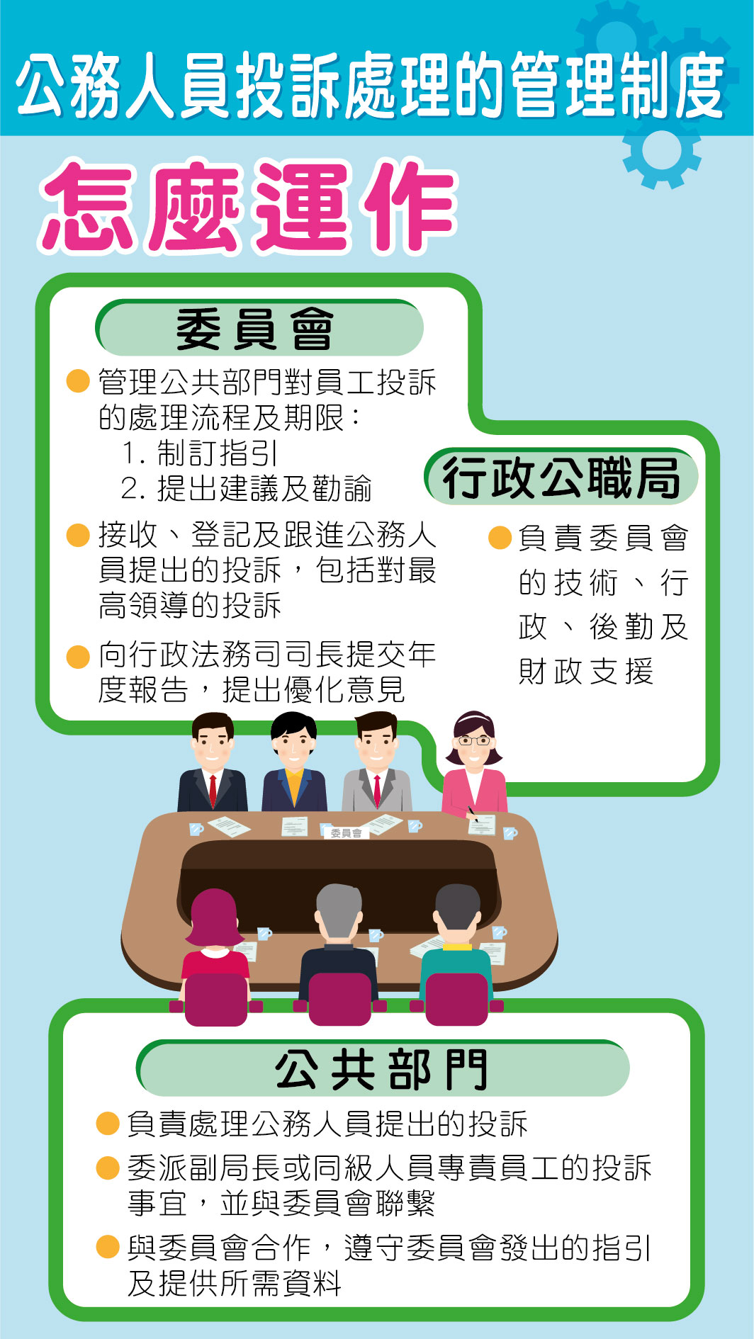 “投訴制度”規定,公共部門須與“委員會”合作,從副局長或等同職位的據位人中指定處理投訴的負責人。如工作人員不滿意公共部門處理其投訴的結果,可要求“委員會”介入協調。