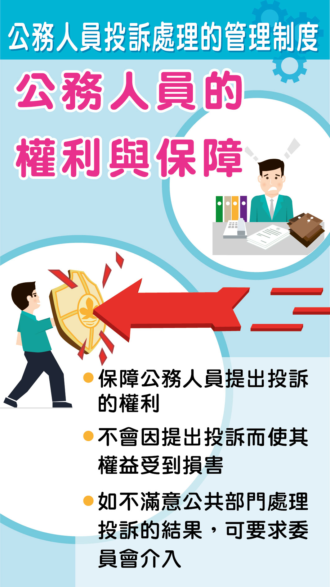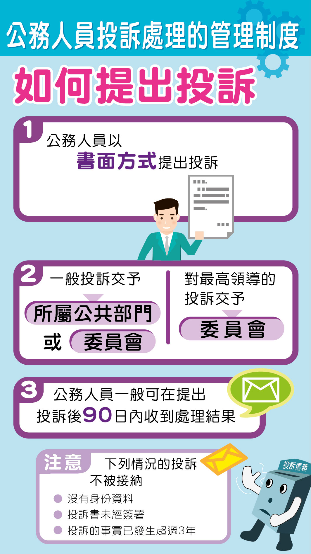 因應制度的實施,將設立“公務人員投訴處理管理委員會”確保投訴處理的目的、原則及規則得以遵守。公務人員可向所屬部門或直接向“委員會”提出投訴。各公共部門須按“委員會”發出的指引處理投訴。此外,“委員會”亦負責接收針對公共部門最高領導的投訴。