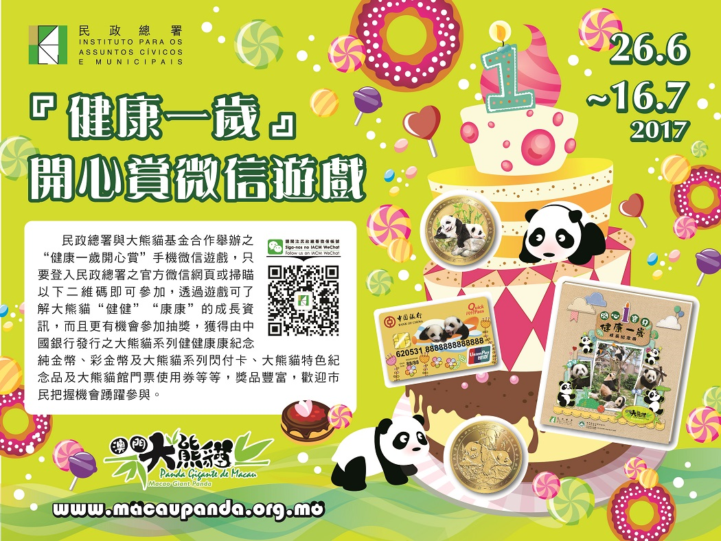 為了慶祝大熊貓寶寶“健健”和“康康”的第一個生日,民政總署與大熊貓基金合作舉辦大熊貓“健康一歲”慶生系列活動,當中包括合辦“健康一歲開心賞”手機微信遊戲,有機會贏取金幣。
