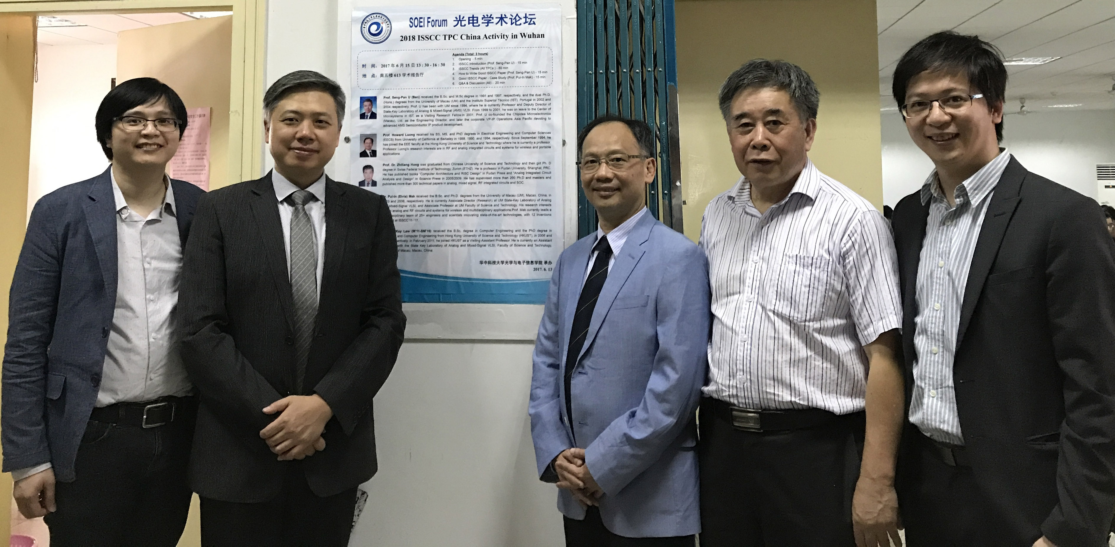 澳門大學三名國際電機電子工程師學會(IEEE)2018年國際固態電路峰會(ISSCC,又稱“芯片奧林匹克”)國際技術議程委員會委員:模擬與混合信號超大規模集成電路國家重點實驗室二位副主任余成斌(新諾普思澳門)和麥沛然、助理教授羅文基,率領代表團到武漢“光谷"及南京“無線谷"進行推廣演說,分享國際固態集成電路最新發展趨勢,吸引逾百位微電子業界人士、專家學者到場交流。