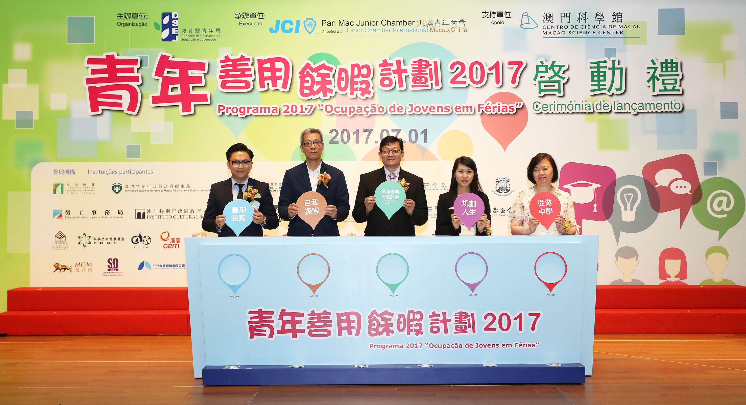 為配合澳門青年政策有關增進社會流動的政策方向,特區政府一直致力創造有利條件,提升青年適應社會變化的能力,協助青年進行生涯規劃,提升其競爭潛力。由教育暨青年局主辦、汎澳青年商會承辦及澳門科學館股份有限公司支持,並由澳門各公共部門和私營機構共同參與推動的“青年善用餘暇計劃2017”啟動禮於7月1日(星期六)下午3時假澳門科學館會議中心順利舉行。