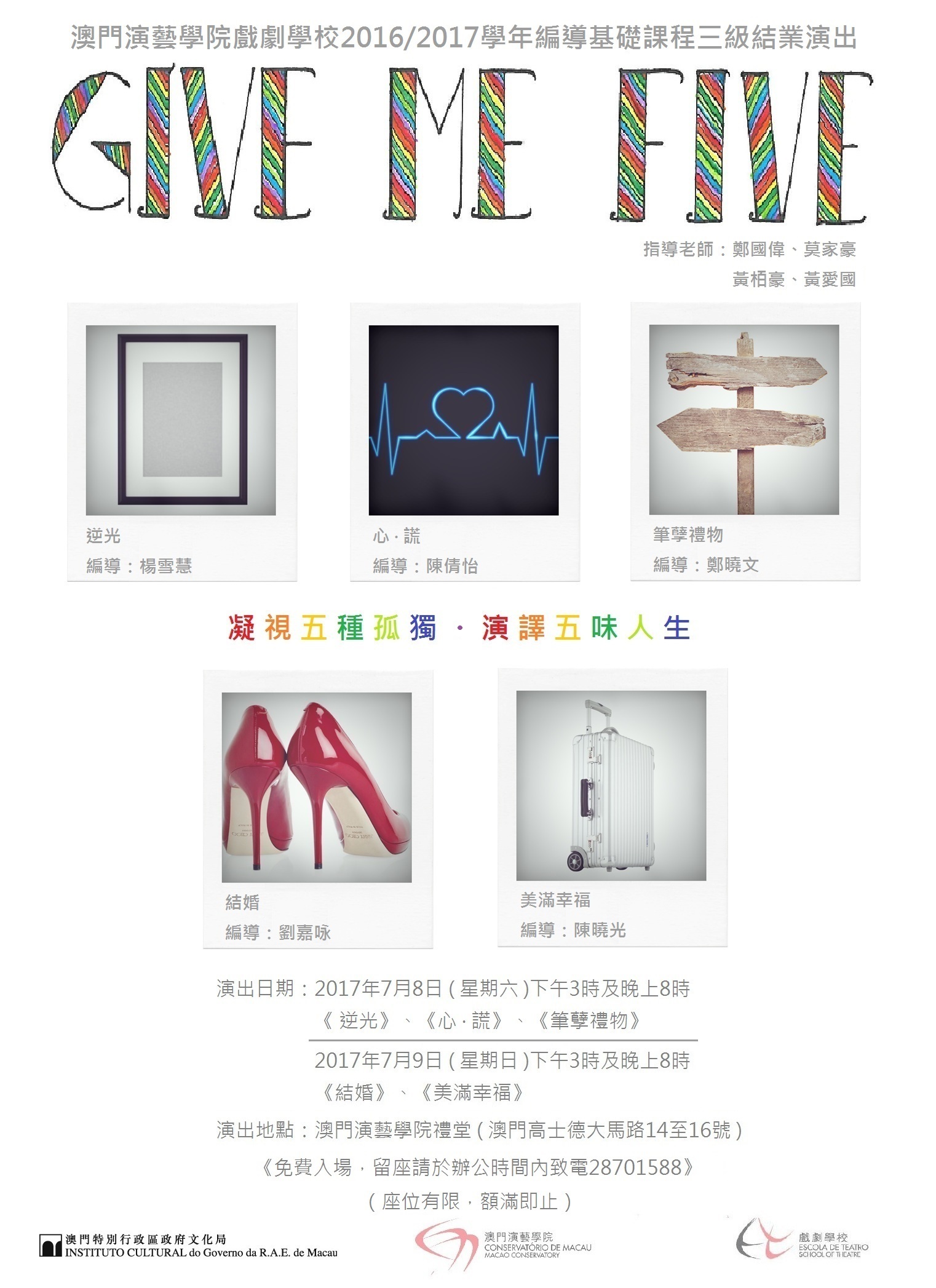 編導基礎課程三級結業演出《GIVE ME FIVE》於七月八日(星期六)下午三時及晚上八時呈獻《逆光》(楊雪慧編導)、《心.謊》(陳倩怡編導)及《筆孽禮物》(鄭曉文編導);於七月九日(星期日)下午三時及晚上八時演出《結婚》(劉嘉咏編導)及《美滿幸福》(陳曉光編導),免費入場,有興趣的市民可由即日起於辦公時間內致電二八七零一五八八留座。座位有限,先到先得,座滿即止。