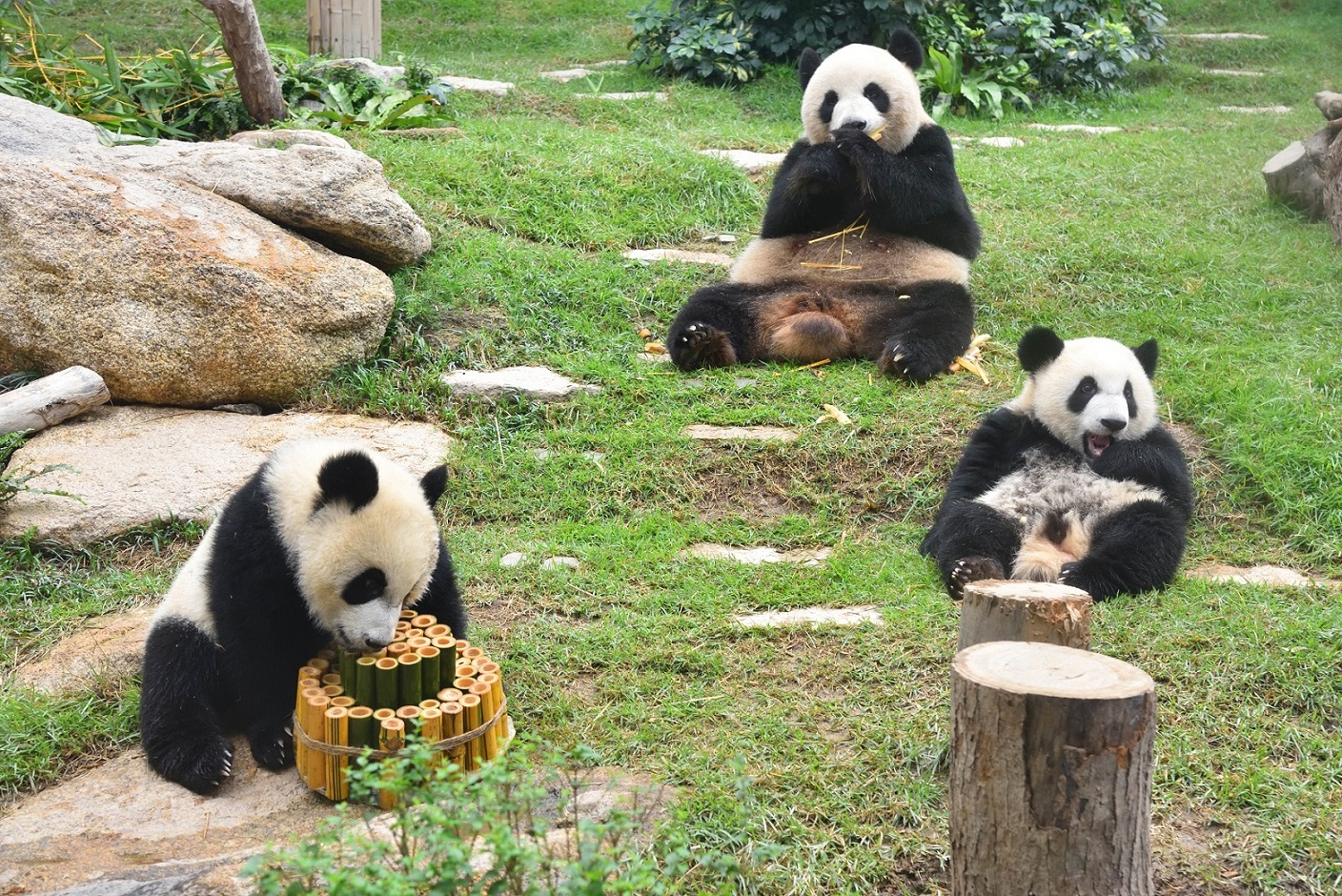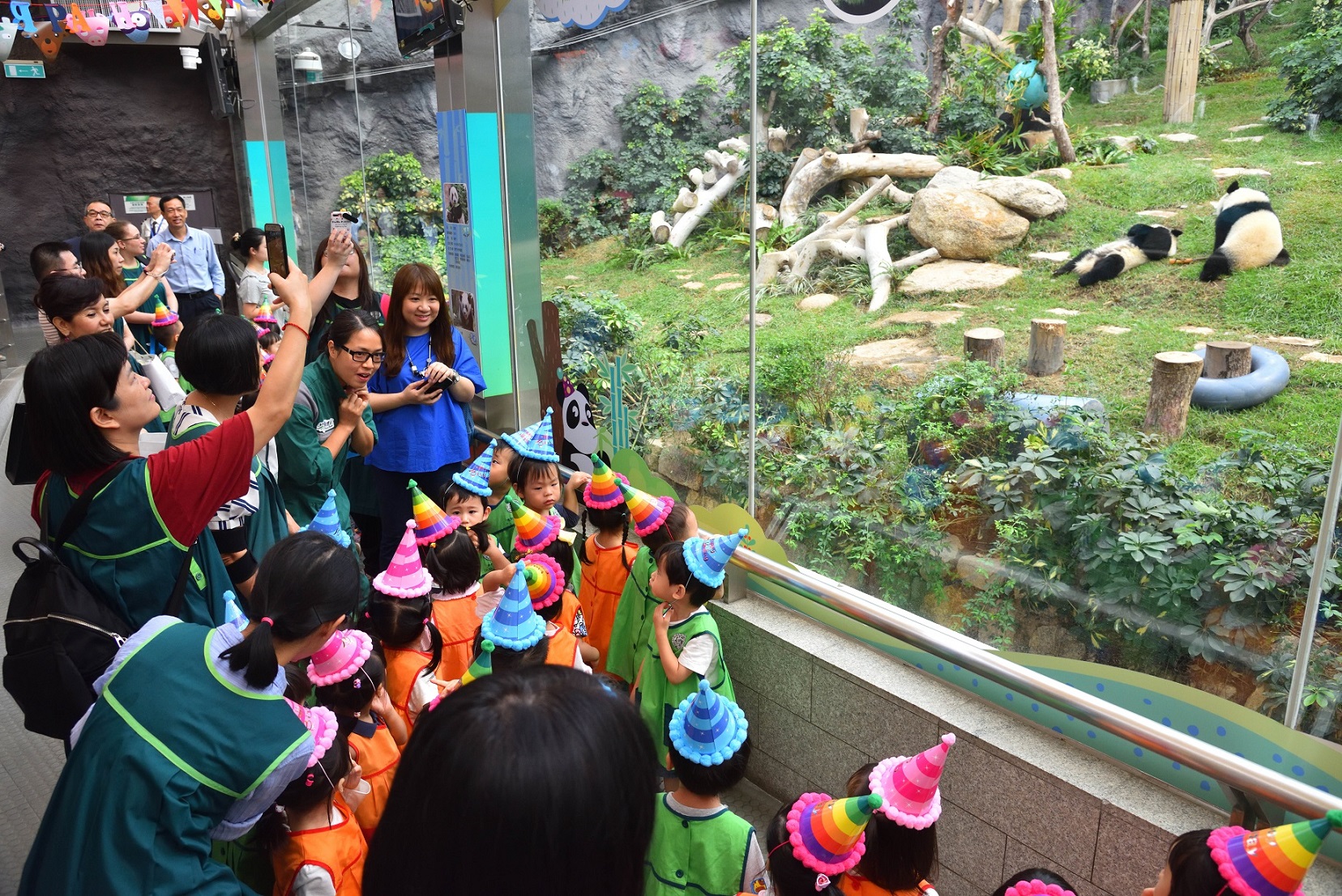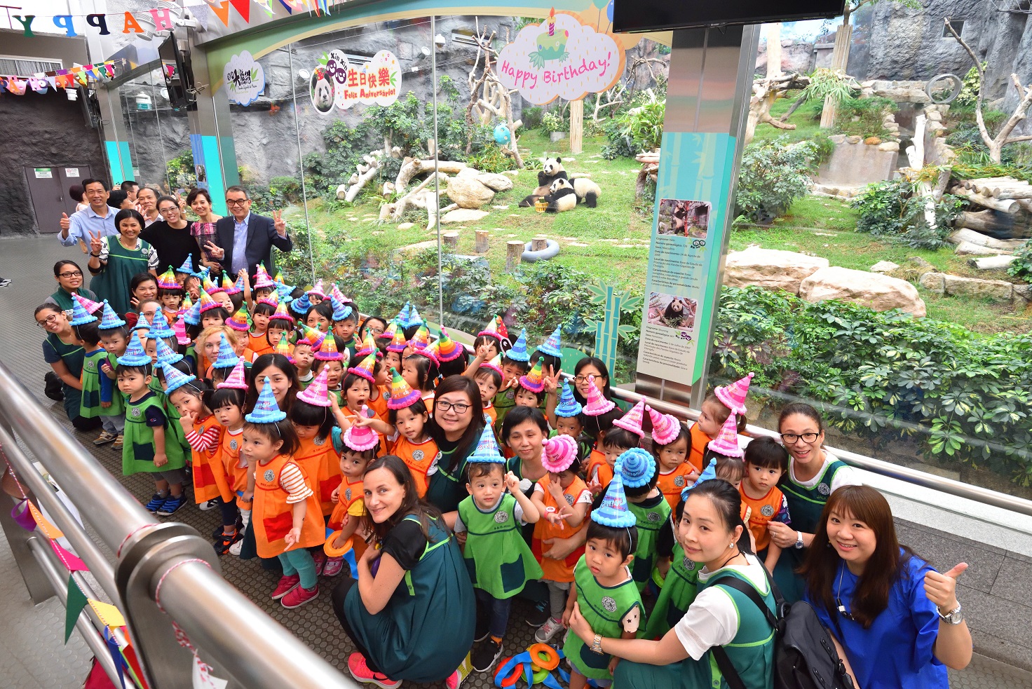 大熊貓寶寶“健健”、“康康”於上月底剛慶祝完一歲生日,大熊貓媽媽“心心”則於七月五日生日,民署邀請了仁慈堂托兒所的小朋友及工作人員約一百人一起慶祝“心心”的十歲生日。在場小朋友更為“心心”高唱生日歌,送上祝福。“心心”的一對寶貝“健健”“康康”亦陪同媽媽出席生日會,並一起享用為“心心”特別製作的竹葉蛋糕,吃得津津有味。活潑淘氣的孖寶趣緻反斗,鬼馬表情令在場的小朋友哈哈大笑,並爭相拍下大熊貓可愛有趣的一刻。