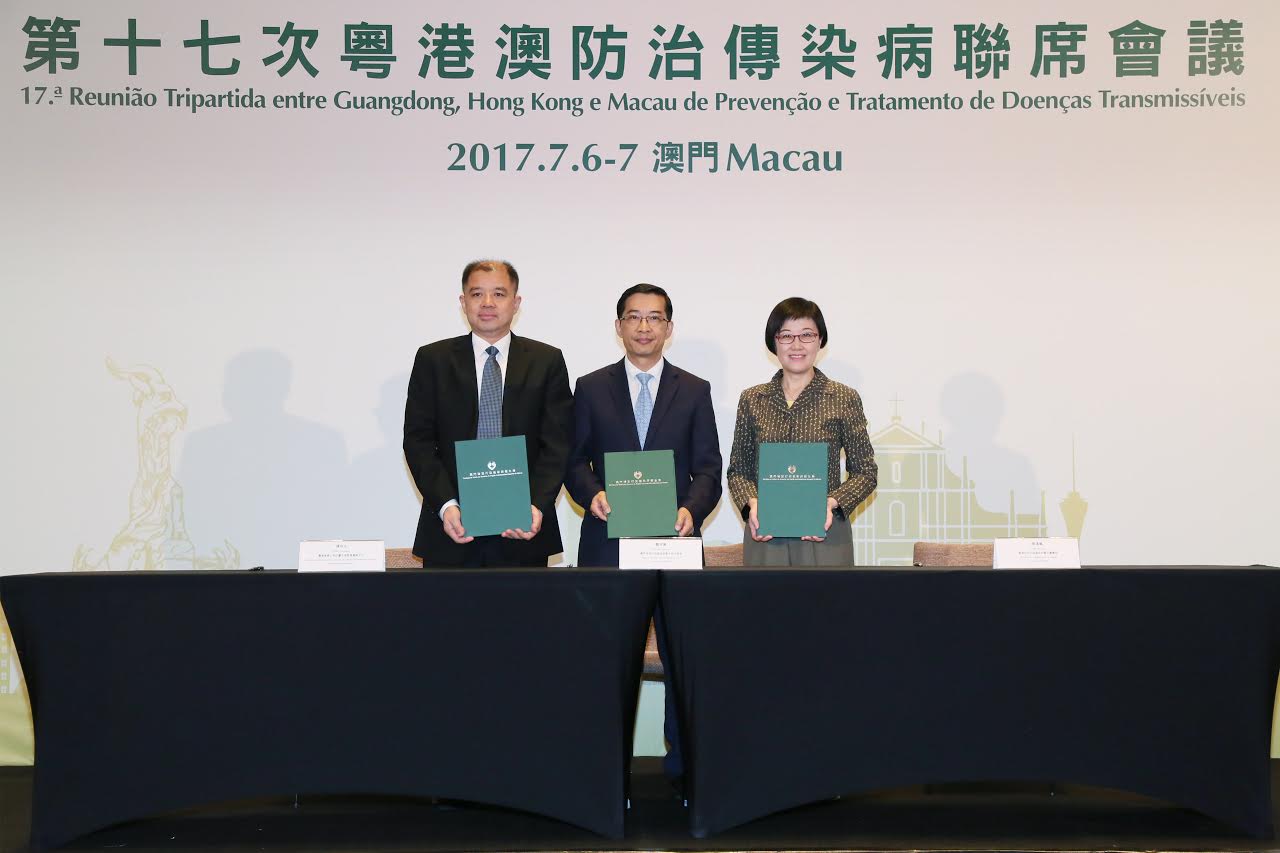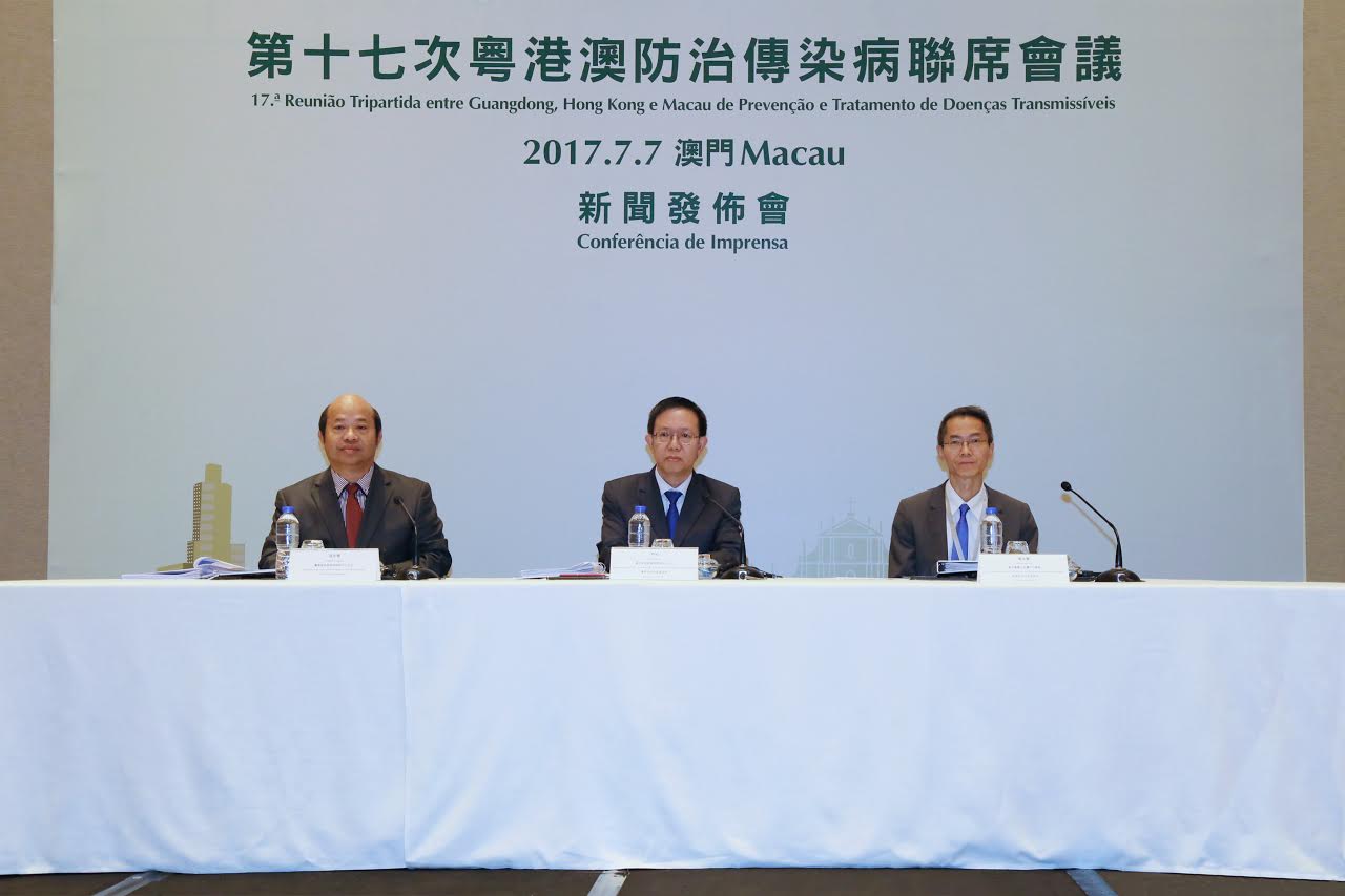 由衛生局舉辦的〝第十七次粵港澳防治傳染病聯席會議〞於昨日(7月6日)及今日(7月7日)一連兩天在澳門舉行,衛生局鄭成業代局長、廣東省衛生和計劃生育委員會陳祝生副主任和香港衛生署陳漢儀署長分別率團出席會議。三地專家共約62名。