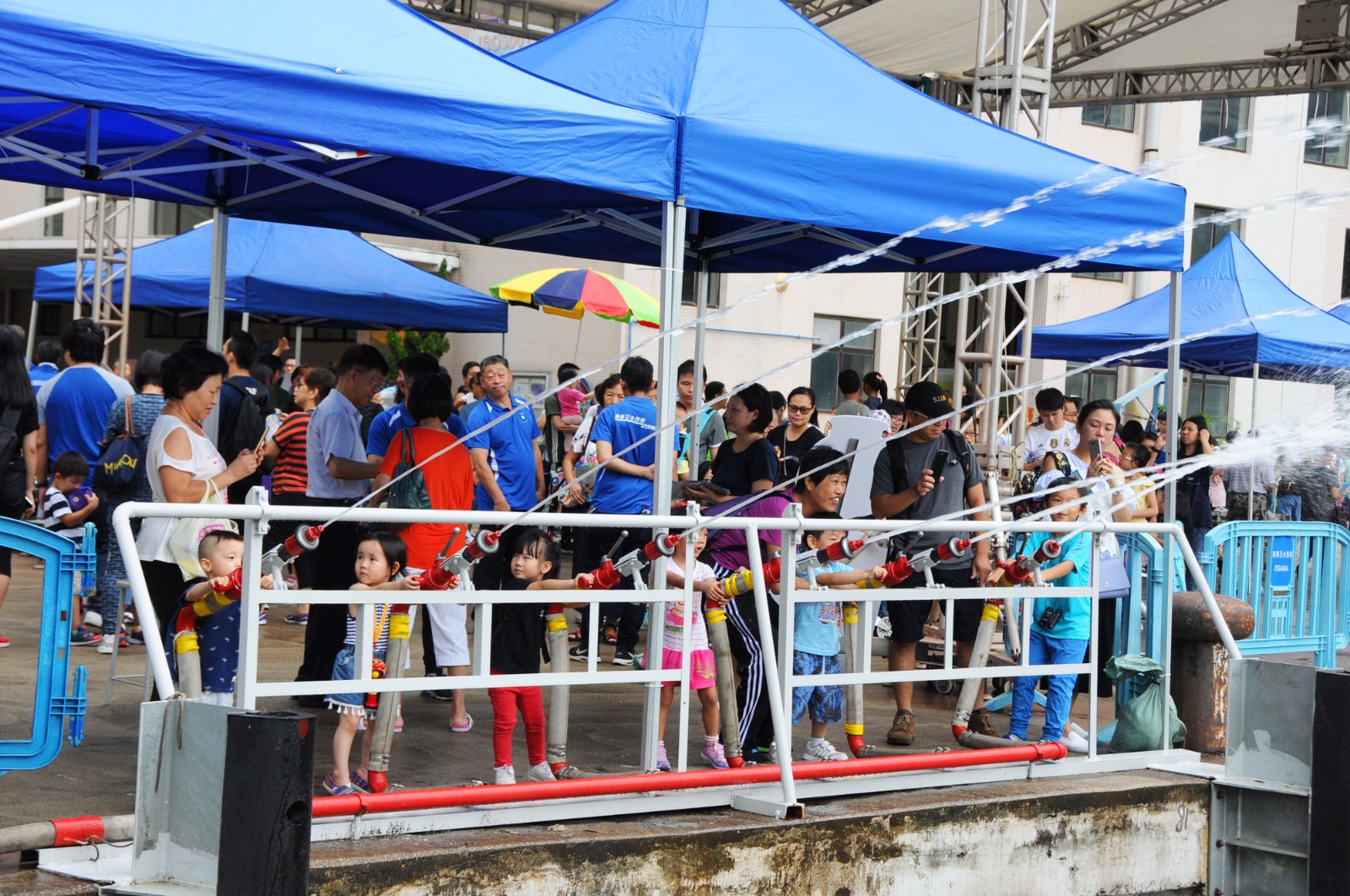 同樂日現場設有多個以海事安全和節約用水為主題的攤位遊戲,還有真人版遊戲棋,而深受小朋友歡迎的節水英雄“威水超人”和“水汪汪姐姐”亦親臨現場帶來精彩演出。另外,活動提供難得的機會讓市民模擬體驗水手的日常工作以及學習海事技能,例如模擬射水炮、拋繩繫纜、編織海事繩結等,一嘗水手工作的樂趣。政府船塢的造船部、機械部以及抱船車等特有設施亦有開放,來到參觀的市民登上海事工作船隻,以及坐上水上救援電單車拍照留念。開放日活動宣傳教育之餘不乏玩樂,結伴同遊的親朋都玩得興奮投入,增進了海事知識,亦更了解海事局的職能和人員的日常工作。