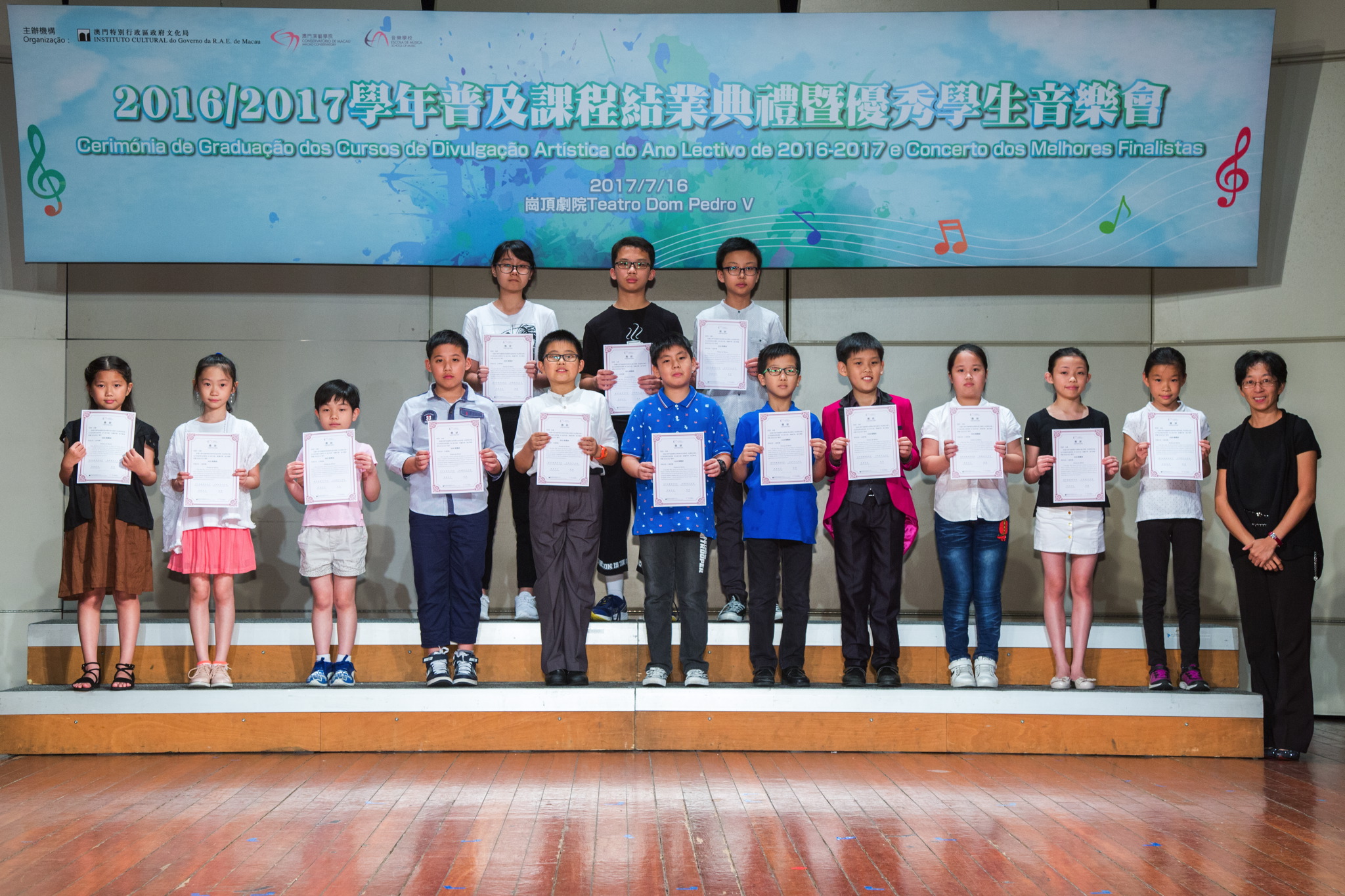 二零一六至二零一七學年普及課程結業典禮暨優秀學生音樂會於七月十六日下午舉行,音樂學校為已完成“先修”、“基礎”、“進階”、“深造”各項普及課程的學生及澳門少年合唱團的啟蒙、基礎級團員頒發結業證書及獎狀。音樂會上普及課程學生與澳門少年合唱團分別為觀眾帶來精彩表演,得到熱烈掌聲。