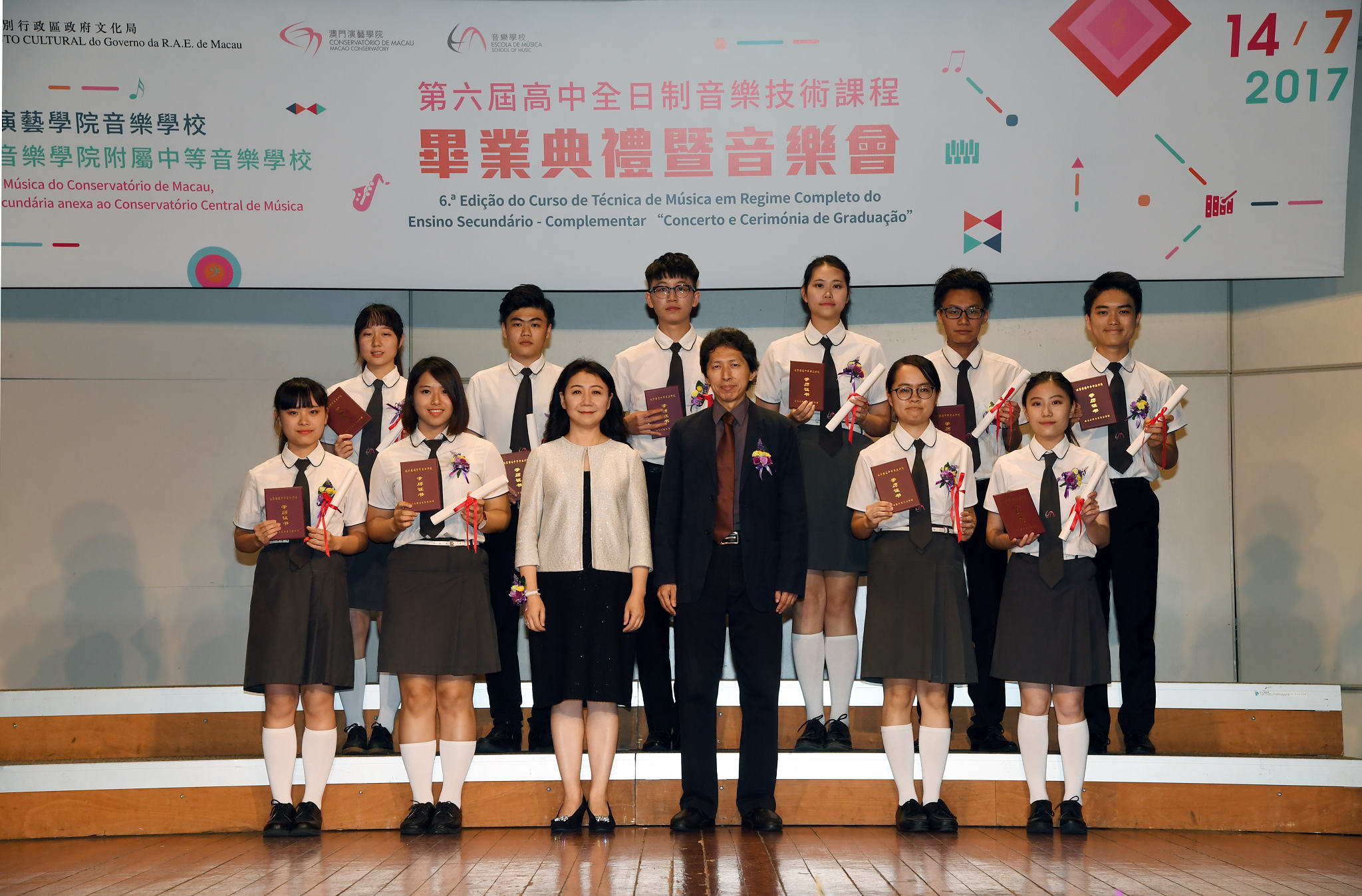 今年音樂學校第六屆全日制音樂技術課程共有十名學生完成相關課程,升大學率達百分之百。畢業生於七月十四日舉行的畢業典禮上均獲頒發由澳門特區政府認可的初中、高中教育課程文憑和音樂技術及專業資格證書,以及由中央音樂學院附屬中等音樂學校頒發的《普通中等專業學校畢業證書》,畢業生獲頒發的證書在澳門、內地乃至於國際上均被認可。典禮上,多位成績優異的畢業生在音樂會上進行獨奏及重奏表演,彙報多年學習成果。