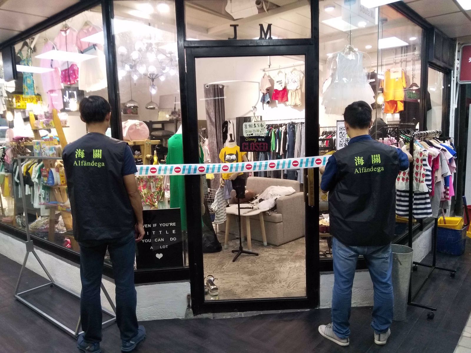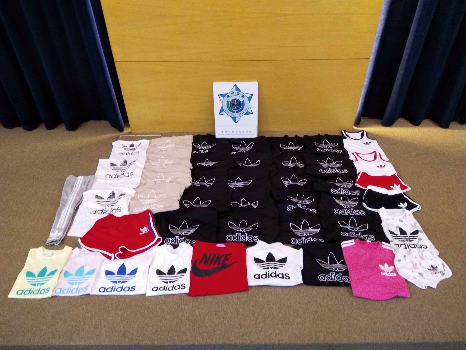 海關偵查人員於7月24日中午,對位於北區的目標店舖採取突擊行動。在品牌權利人的協助下,鑑定店舖出售的43件「ADIDAS」及「NIKE」品牌服裝為冒牌產品,關員將店東拘捕。