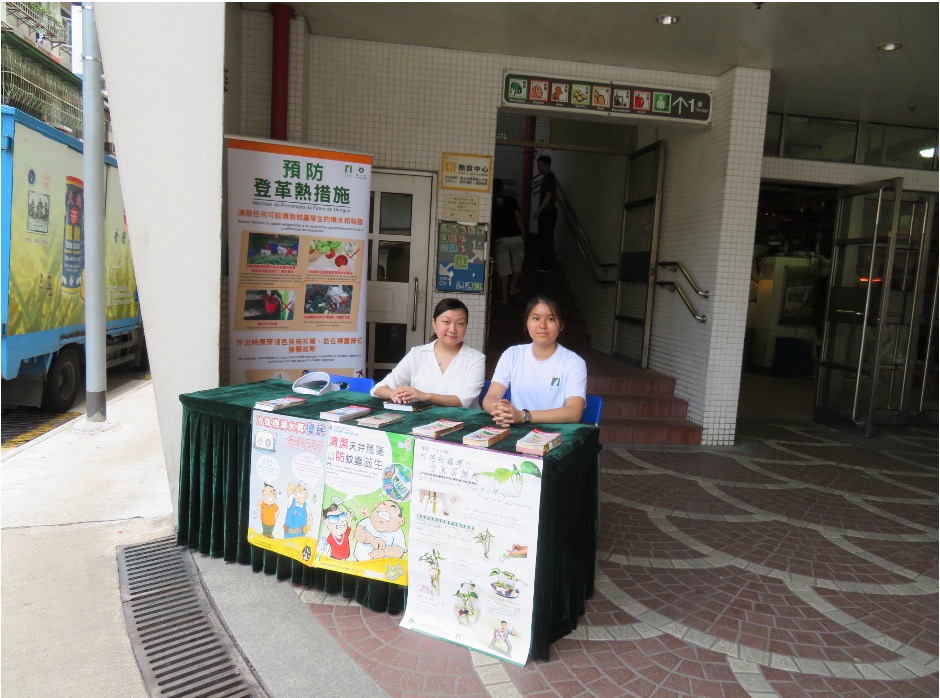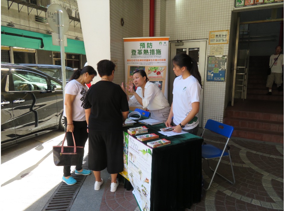 因應在下環區內出現本地登革熱確診個案,預防登革熱工作小組成員民政總署和衛生局派員由8月7日至15日期間於下環街市門口擺放諮詢及宣傳攤位,為居民提供有關預防登革熱的健康諮詢服務,加深居民對登革熱的認識及正確執行防蚊措施,提醒居民注意環境衛生,以減低登革熱在本澳傳播的機會。
