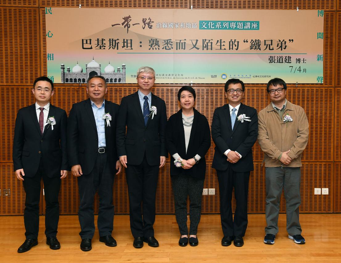 由文化局主辦、澳門科技大學社會和文化研究所協辦的二零一八年度“博聞新聲 民心相通——一帶一路沿線國家和地區文化系列專題講座”已於今日(四月七日)假澳門藝術博物館圓滿開幕,文化局副局長梁惠敏及澳門科技大學副校長龐川於開幕儀式上先後致歡迎辭,預祝系列講座取得圓滿成功。開幕儀式後隨即舉行首場講座“巴基斯坦:熟悉而又陌生的‘鐵兄弟’”,由巴基斯坦伊斯蘭瑪巴德孔子學院中方院長張道建主講,深入淺出地介紹巴基斯坦豐富多彩的歷史文化及生活習俗。