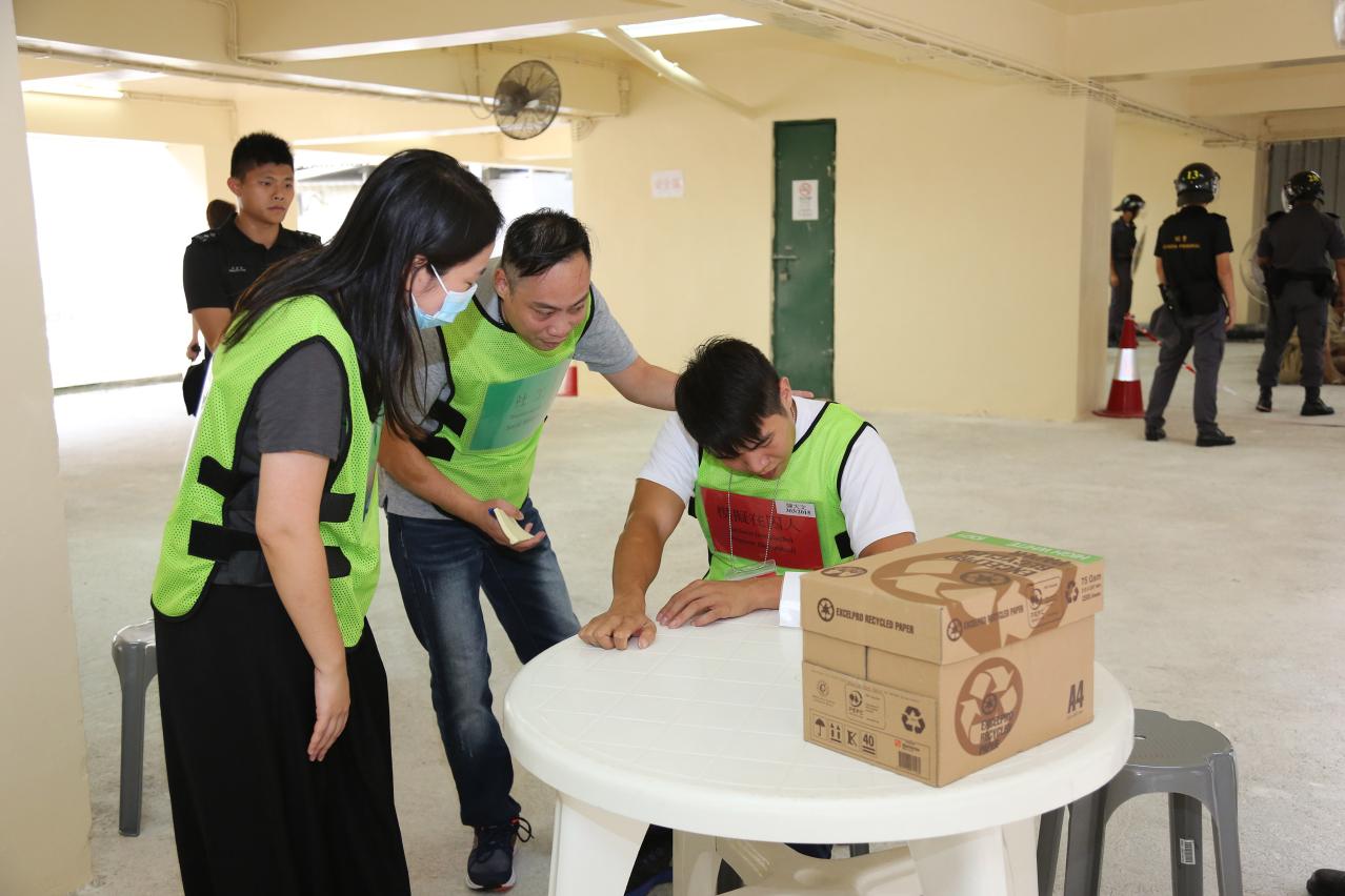 演習期間,模擬三名在囚人頭部及腳部受傷,另有一名獄警腳部受傷,現場醫護人員迅速替傷者診治和包紮傷口,並安排傷勢較嚴重的獄警送院作進一步治療,另有一名在囚人情緒激動,需由社工安撫及提供心理輔導。與此同時,公關人員負責收集火警的最新資訊和統一發佈訊息、接待因火警事故而前來查詢的家屬和記者,以及接聽市民的來電。此外,其他部門亦分別就各自職能提供相關後勤支援工作。