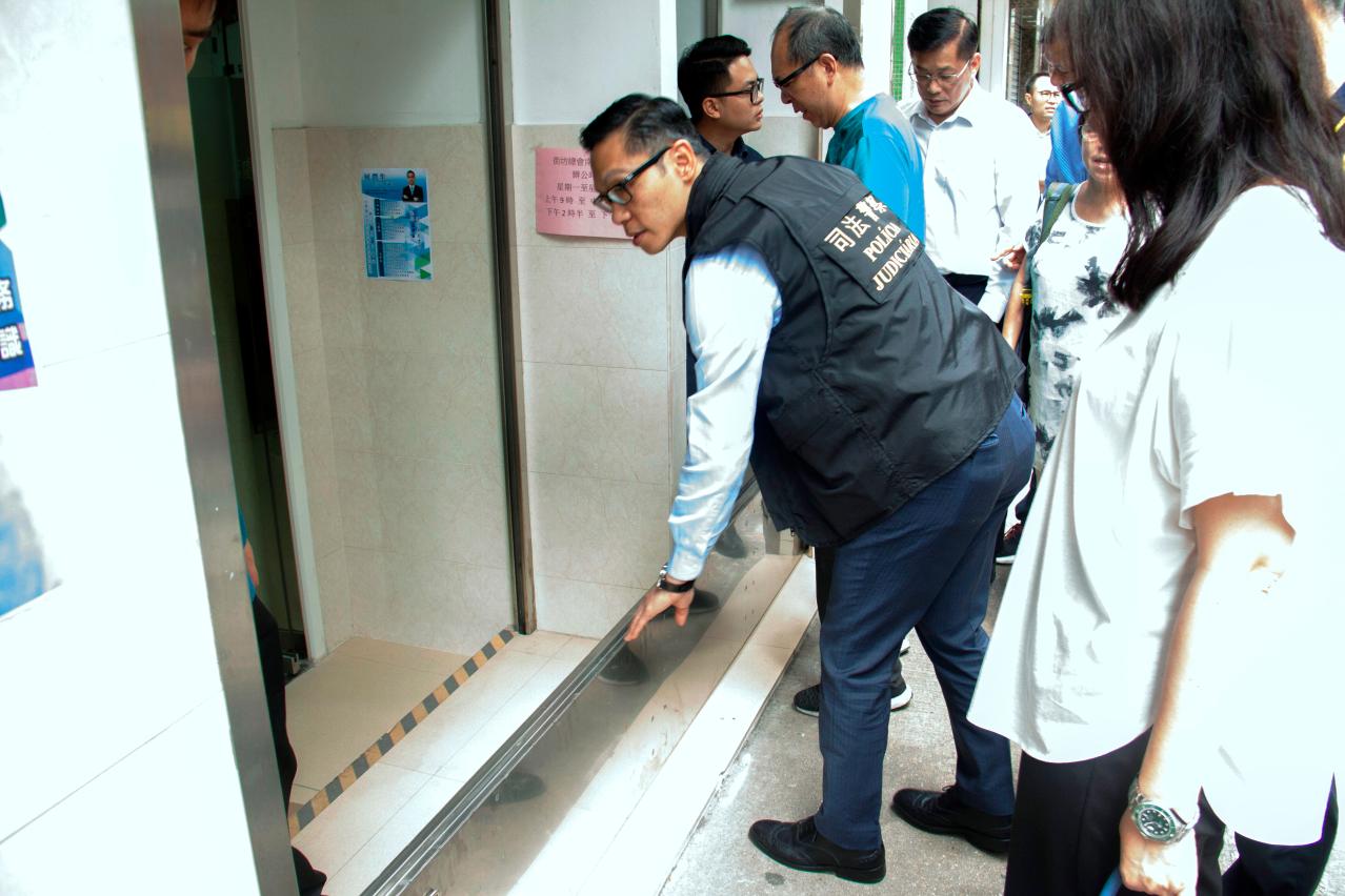 薛仲明局長帶領司警局人員落區向商戶及居民講解颱風來臨時應注意的事項、撤離計劃的內容和程序,並向他們派發撤離計劃宣傳單張及防災知識小冊子,介紹民防訊息的接收渠道。同時,為有效地協助更多居民瞭解及配合撤離行動,司警局已將負責的C區劃分為9個小區,各區設有3至4名隊長,隊長由職務主管或副督察級人員擔任,每組約有20名刑事偵查人員。該9個小區隊長於是次巡視期間亦進行分區巡查,指導商戶安裝擋潮閘,呼籲居民因應自身情況備妥必要的應急物品,當有需要撤離時不要攜帶不必要的財物,各隊人員亦主動解答居民關於防風防災及緊急求助等疑問。