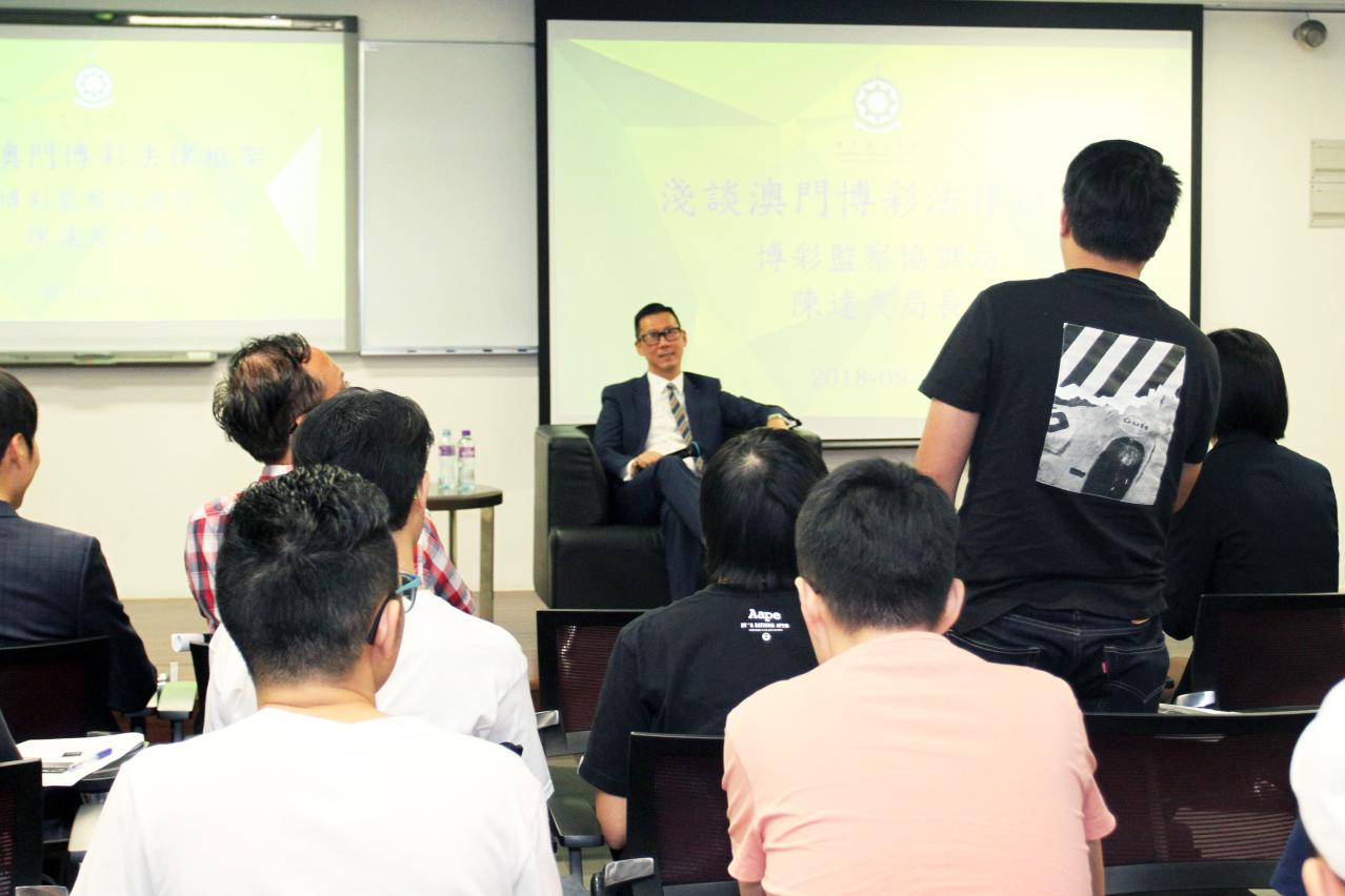 陳達夫從博彩活動的本質及特徵開講,闡述了澳門博彩監管的原則,並結合實際,深入淺出,簡明扼要地講解了娛樂場幸運博彩經營、進入娛樂場和在場內工作及博彩的條件、幸運博彩中介業務、娛樂場博彩或投注信貸、預防及遏制清洗黑錢等法律法規。在講座互動環節,陳達夫還解答及回應了師生就賭牌競投者的資格審查、博彩資金的規管、澳門博彩業在國際競爭中的優勢、電子競技的發展與監管,以及博彩監管的人才需求等提問。陳達夫並勉勵同學們努力學習,站在時代的潮頭,為澳門博彩的健康發展作出貢獻。