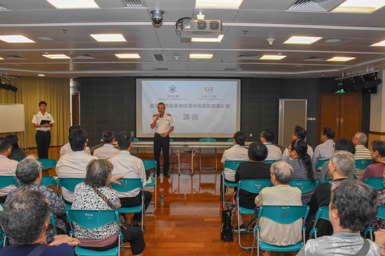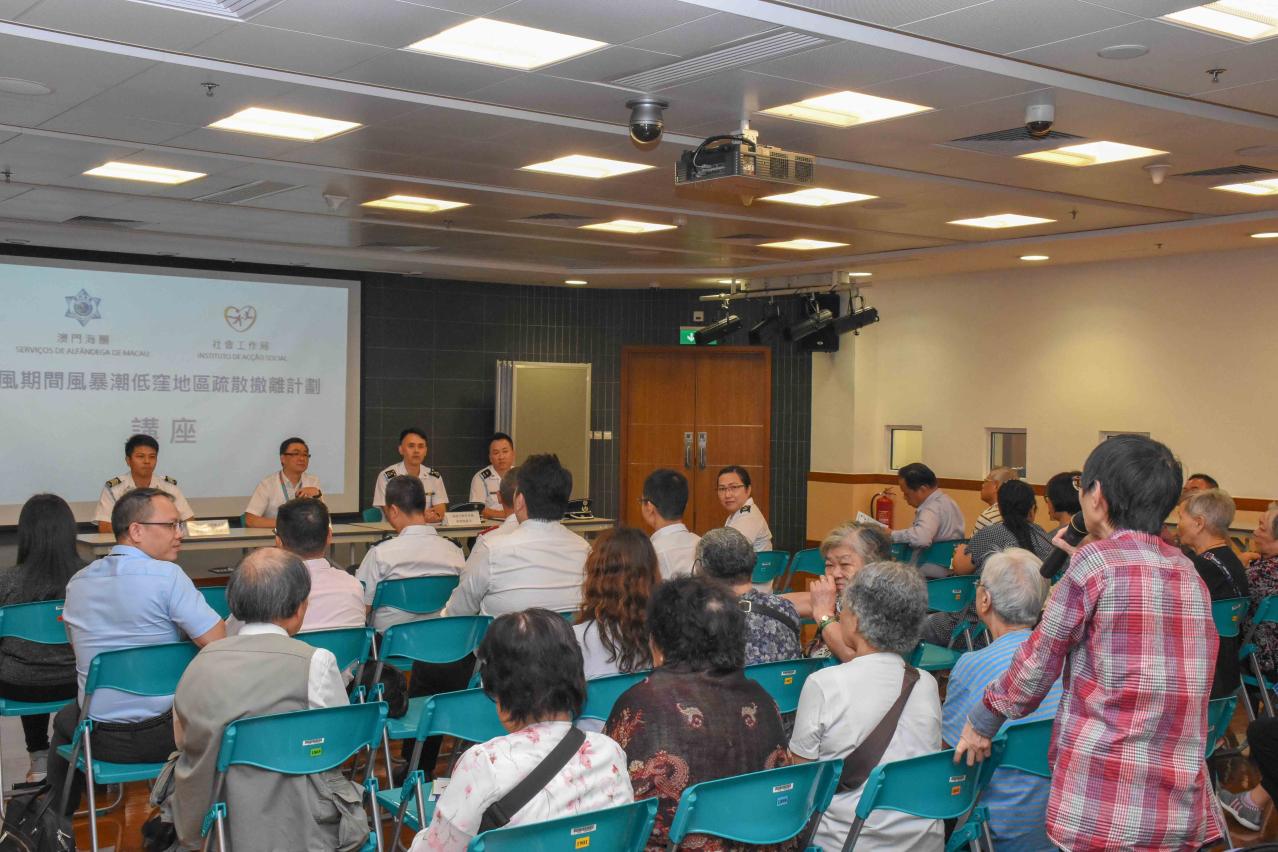踏入十月,本澳仍然處於颱風季節,為提高市民對“颱風期間風暴潮低窪地區疏散撤離計劃”的認識,於10月4日下午,澳門海關聯同社會工作局於下環活動中心舉辦宣傳講座,向84名參與的市民講解計劃內容、注意事項以及介紹防災工作,讓居民於風暴潮來襲時更能配合當局指示,有序安全撤離。