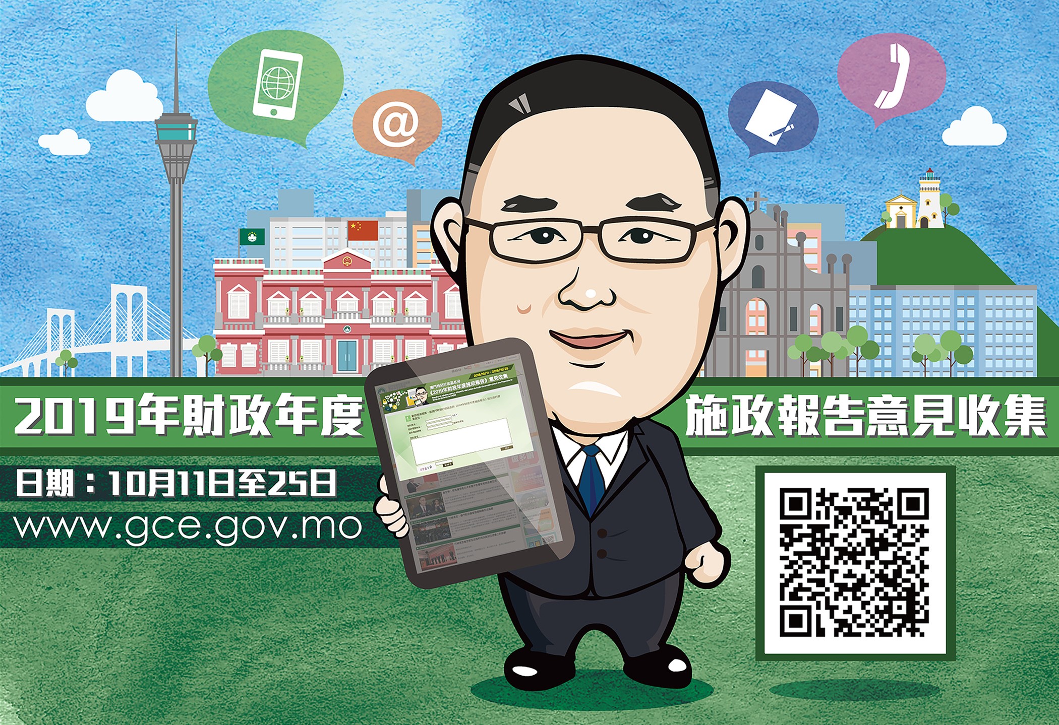 澳門特別行政區政府正制訂《2019年財政年度施政報告》,為廣泛聽取社會各界和廣大居民的意見,特區政府由今(11)日起至10月25日,進行為期十五天的意見收集。