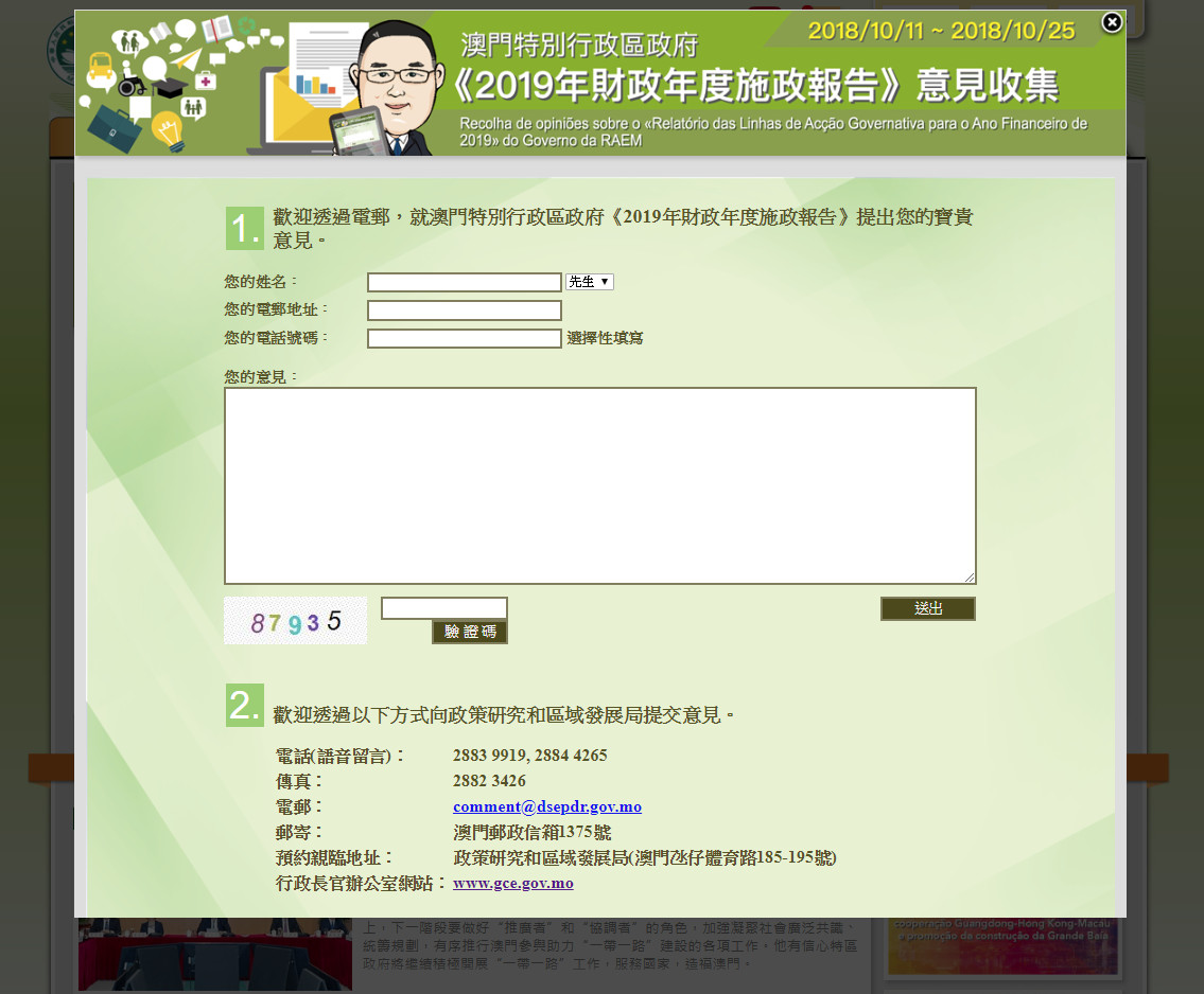 行政長官辦公室特別在網站(www.gce.gov.mo)和手機應用程式(澳門特首辦)開通專頁,讓公眾發表意見;政策研究和區域發展局同步開通語音留言電話專線(2883-9919、2884-4265)、傳真(2882-3426)、電郵(comment@dsepdr.gov.mo)收集意見,居民也可選擇郵寄(澳門郵政信箱1375號)或預約親臨政策研究和區域發展局(澳門氹仔體育路185-195號),表達對明年度施政報告的意見。
