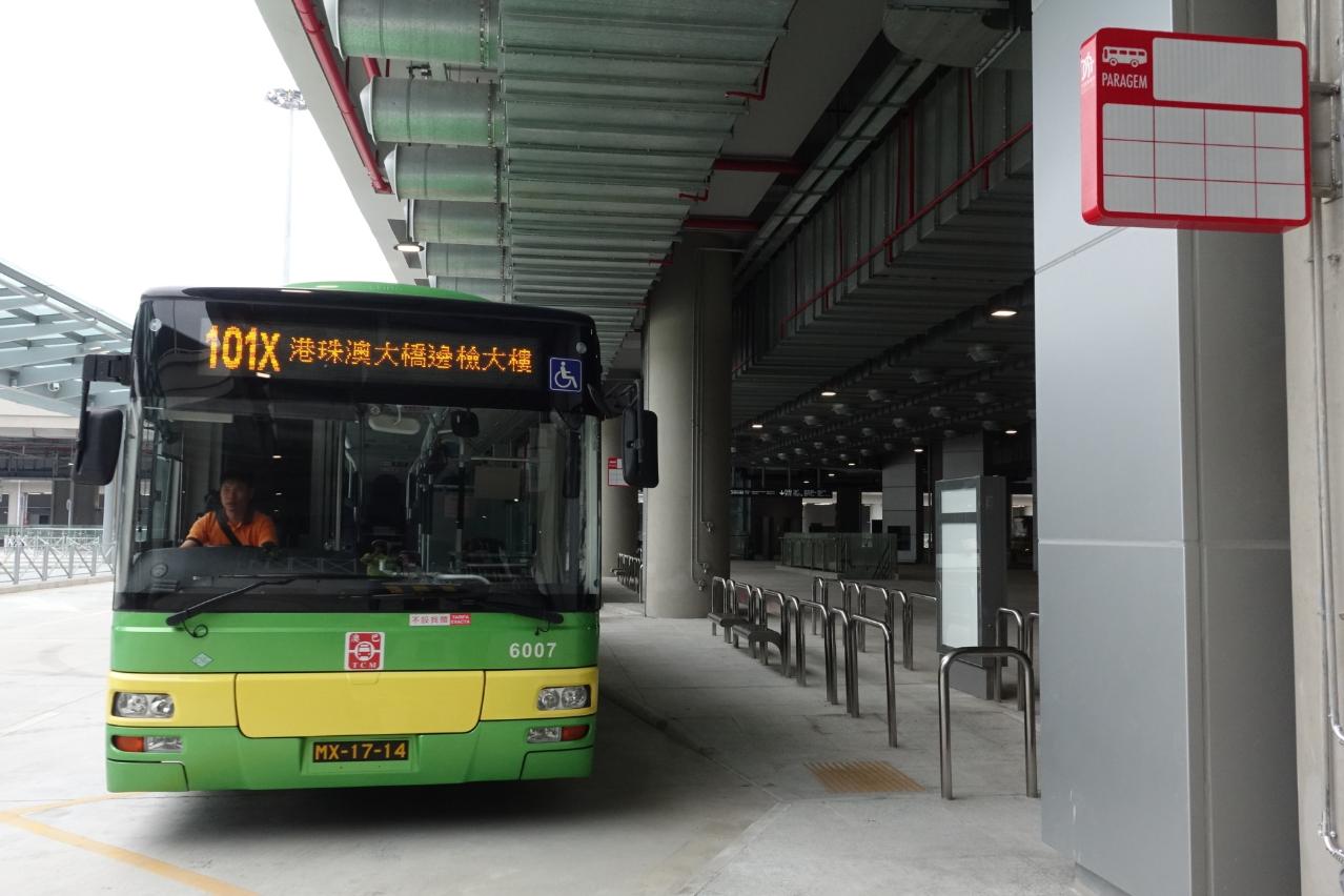至於兩條巴士路線101X及102X,將分別接駁澳門口岸管理區至澳門市區及氹仔市區,當中101X路線提供24小時服務,班次由8分鐘至30分鐘不等:102X路線則由上午7時至晚上11時提供服務,班次由12至20分鐘不等(詳情參閱附表),兩路線同時使用港珠澳大橋邊檢大樓旁的巴士總站,該站採用一樓層落客、地面層上客的形式運作。