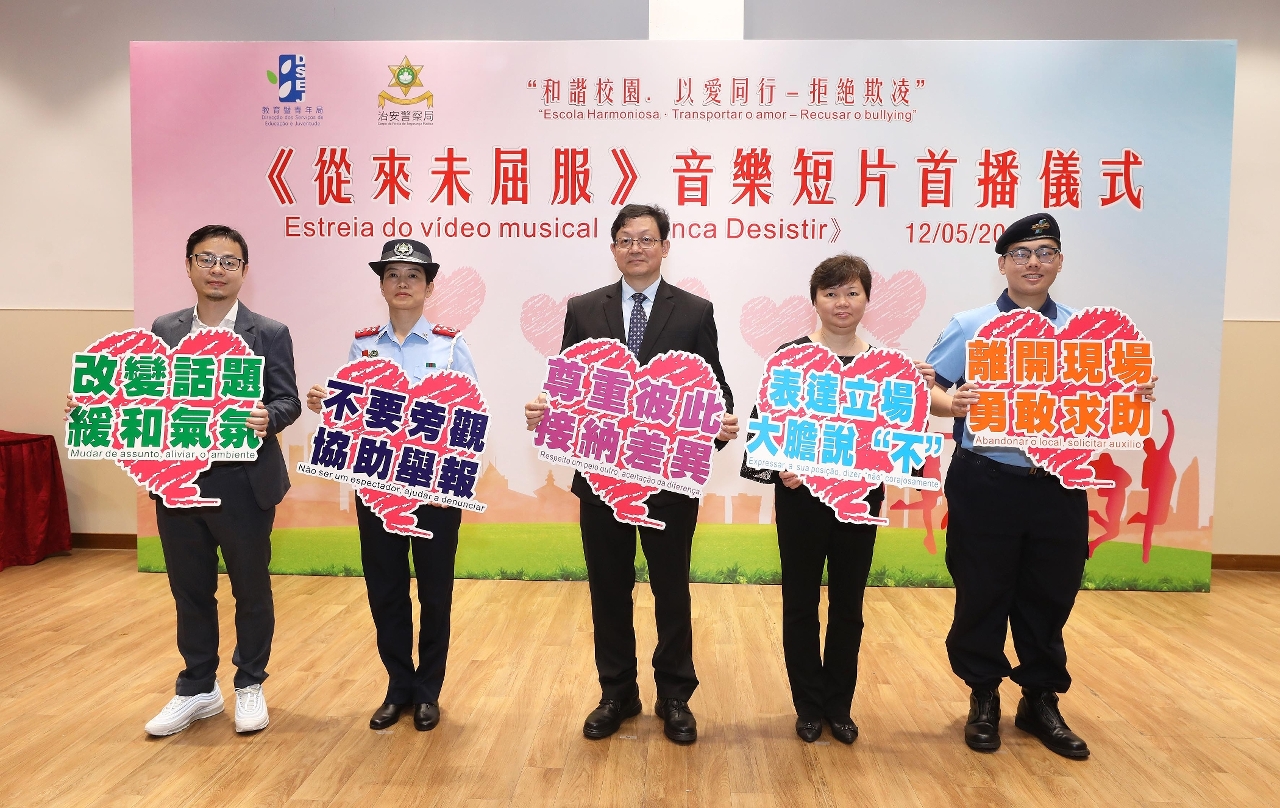 為加強推動和諧校園的重要訊息,教青局與治安警察局攜手製作了“和諧校園.以愛同行 - 拒絶欺凌”《從來未屈服》音樂短片,並安排該短片於5月12日舉行首播儀式,教青局局長老柏生、副局長梁慧琪、治安警察局副局長劉運嫦、學校師生代表、學生輔導服務機構及社團代表、音樂短片製作團隊成員等逾二百人出席了首播儀式,場面溫馨熱閙。教青局期望透過短片向公眾宣導共建和諧的校園和社區是每一個人的責任。歡迎市民於教青局和諧校園網頁瀏覽及下載該音樂短片。(https://portal.dsej.gov.mo/webdsejspace/site/harmony/index.jsp)