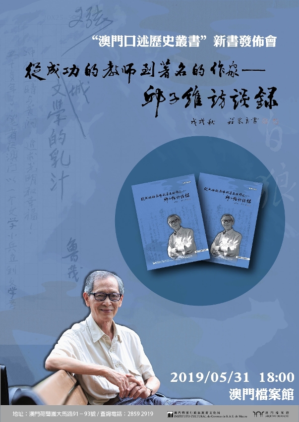 文化局將於5月31日(星期五)下午6時在塔石廣場澳門檔案館舉行《從成功的教師到著名的作家──邱子維訪談錄》新書發佈會,介紹新書內容,歡迎公眾參與。