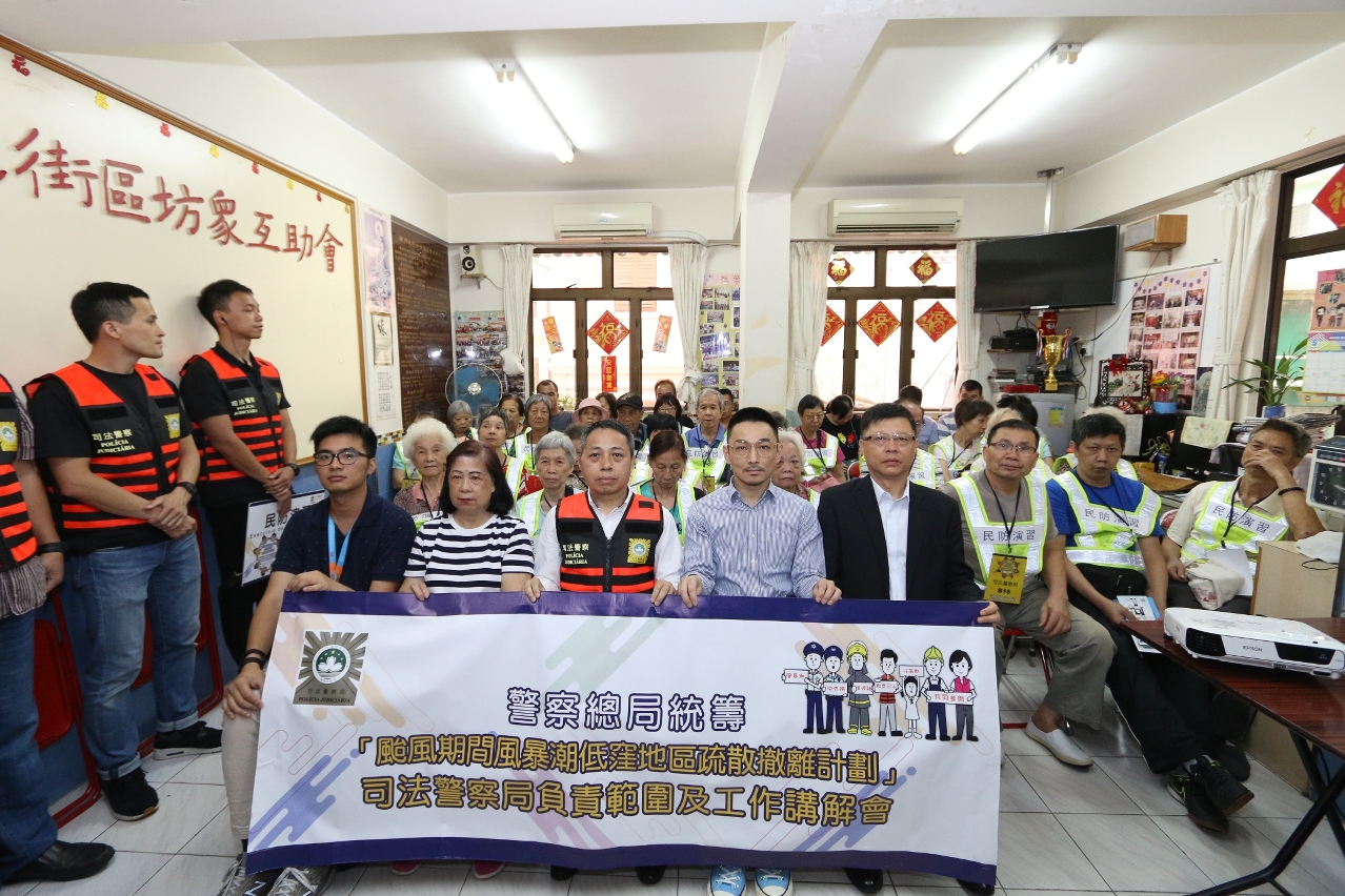 颱風季節將至,為進一步加強市民的防災避險意識,確保市民於颱風期間風暴潮來襲時,能夠按照當局指示迅速、安全有序撤離,在警察總局統籌下,司法警察局與社會工作局合作舉辦“颱風期間風暴潮低窪地區疏散撤離計劃”工作講解會及模擬演習,並公開接受市民報名參與,旨在加深市民對撤離工作流程的瞭解,加強司警局撤離小隊的疏散應變和協調能力,以及收集市民對撤離工作的意見,進一步優化相關工作流程。