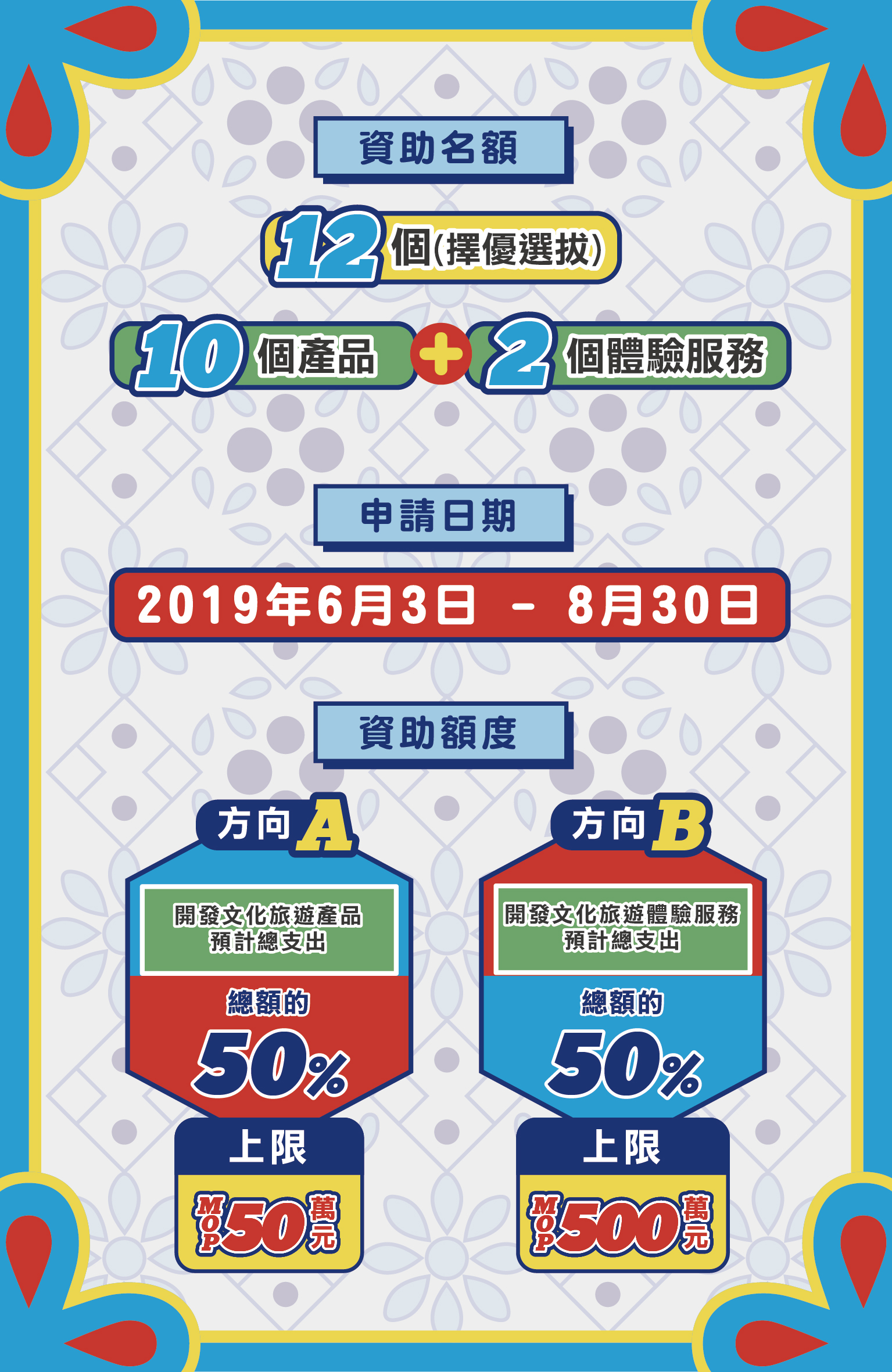 專項資助計劃經擇優選拔後,“開發文化旅遊產品” 資助名額10個,“開發文化旅遊體驗服務” 資助名額2個,項目執行期24個月。資助額度為項目總支出的50%,上限為“開發文化旅遊產品”50萬澳門元,“開發文化旅遊體驗服務”500萬澳門元。基金對項目的資助以實報實銷形式進行,資助款項以封閉式專項帳戶管理,並輔以經核數公司審核帳目,以確保公帑的有效運用。