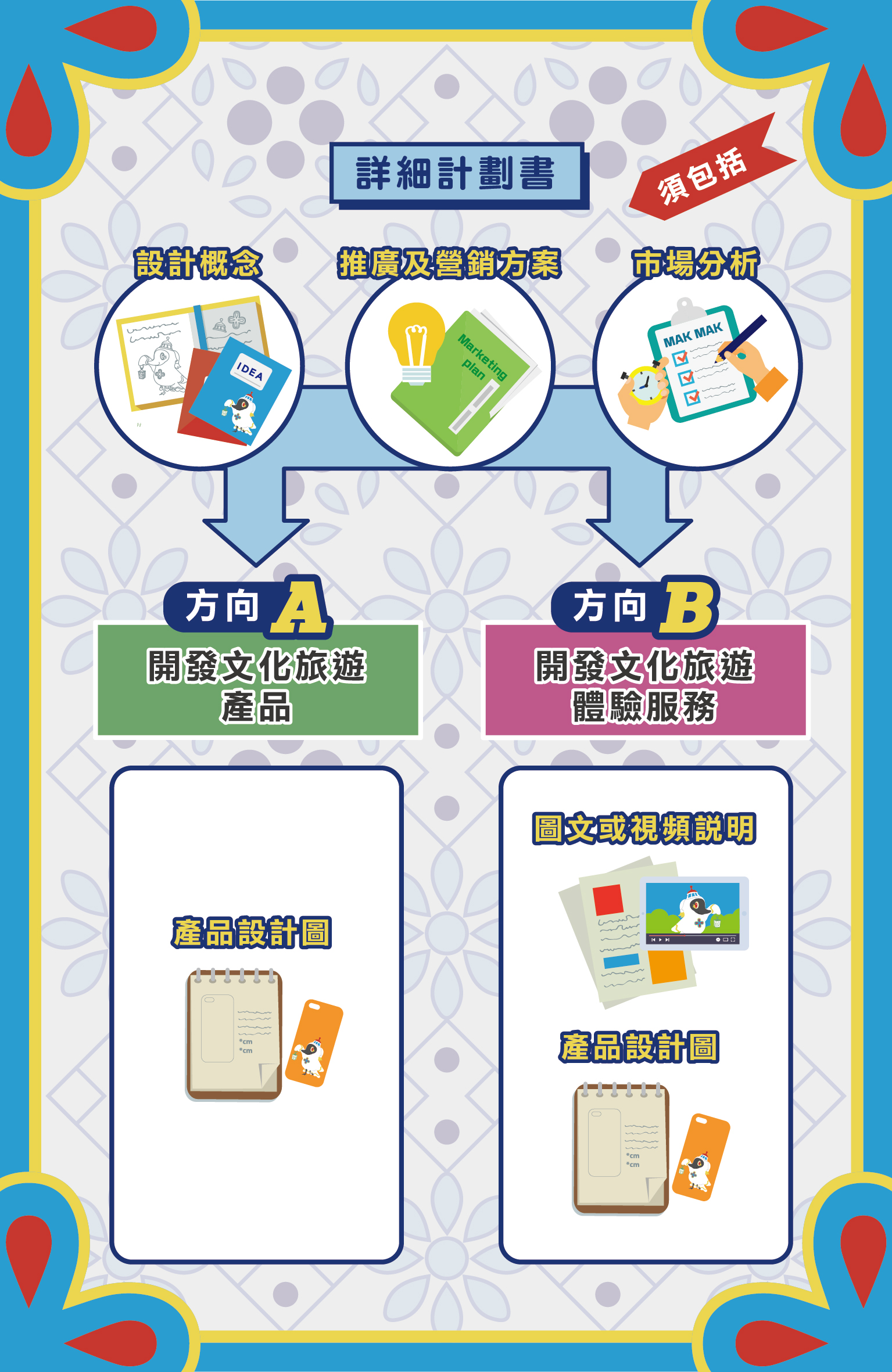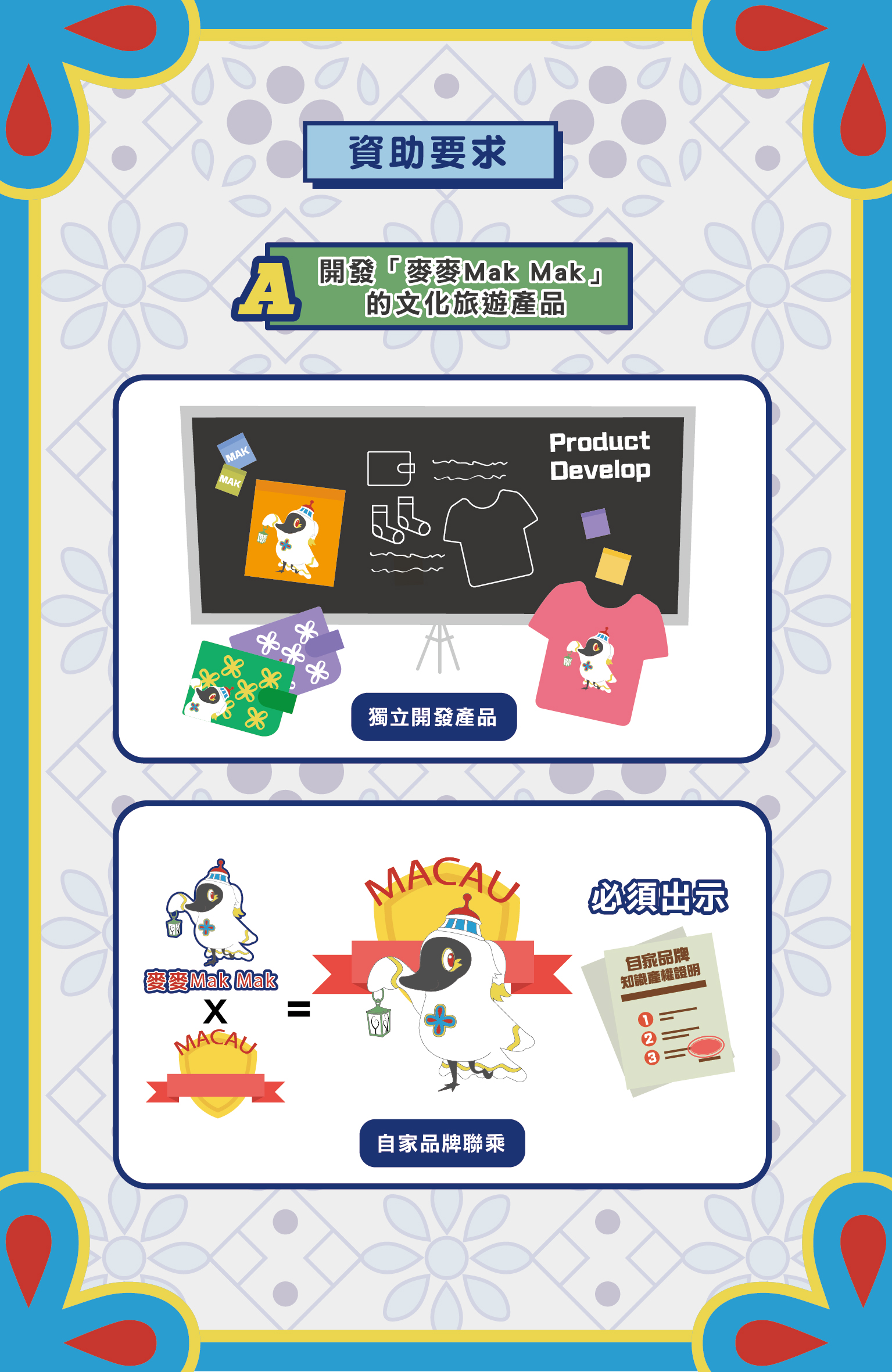 專項資助計劃分為“開發文化旅遊產品”及“開發文化旅遊體驗服務”兩個方向,其中開發“麥麥 Mak Mak”文化旅遊產品分為獨立開發產品及自家品牌聯乘兩類,申請者可按自身情況選擇合適的項目。