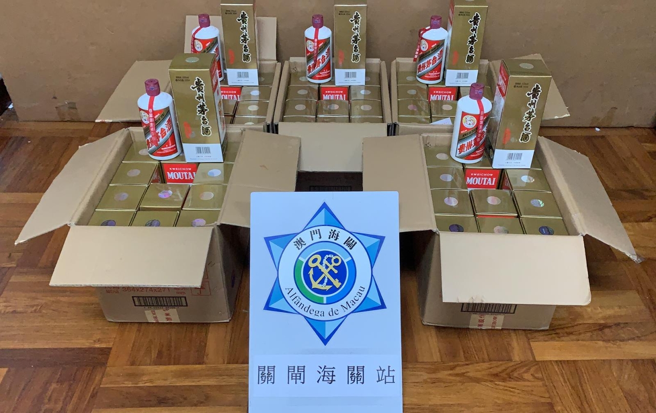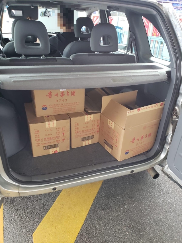 29日下午,一輛粵澳兩地牌私家車經關閘口岸車道出境時,被海關風險管理系統判斷為需接受檢查。關員檢查當場發現,私家車尾箱載有5箱未經申報的茅台酒,合共60支,總量共30公升。其後,海關再透過系統截獲另一宗走私案件,一輛入境的兩地牌車被發現藏有30公斤豬肉及1公斤豬內臟,全數未經檢疫。