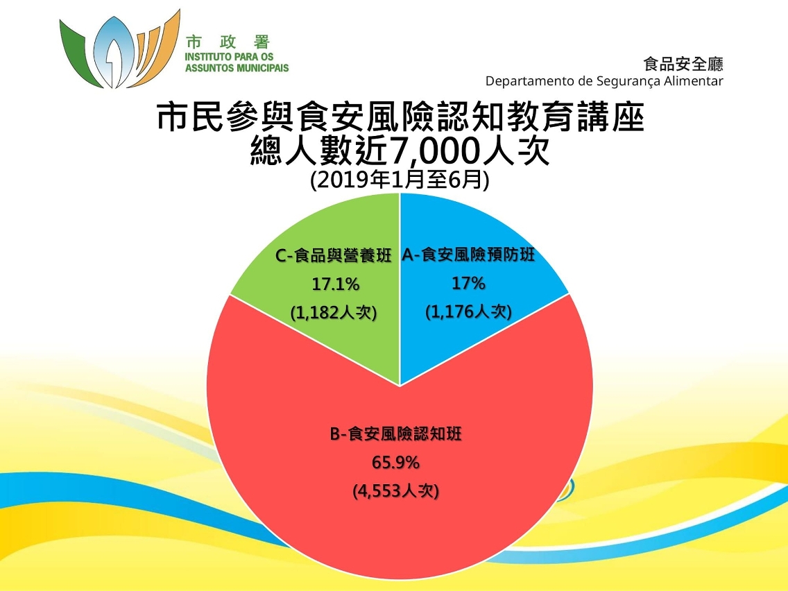 為提高社會對食品安全風險認知水平,讓公眾具備更深入的自主食安防護意識,巿政署持續向廣大市民提供系統化的食品安全教育講座,教導如何運用正確的方式,從日常生活入手預防或降低食安風險。總結2019年上半年,合共為本澳各教育機構及團體舉辦了133場食安教育講座,近7000人次參與。此外,新學年開學來即,市政署積極與本澳各學校及團體合作,持續在社區及校園舉辦不同主題的食安教育講座,教導公眾學習並掌握食安風險控制要點,有系統地推動食安科普知識融入日常生活。